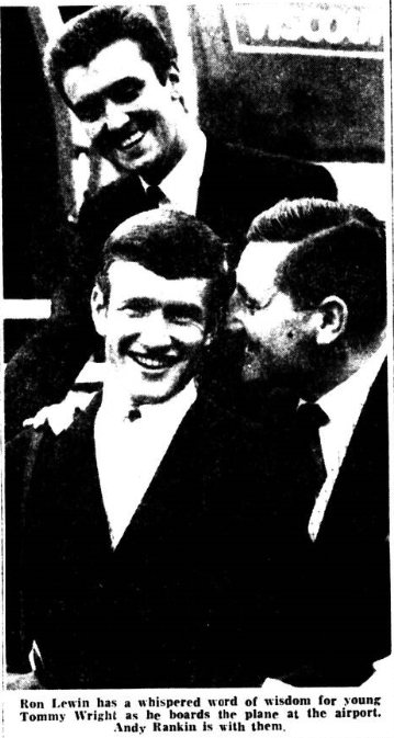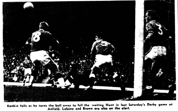 One or two are worthy of special mention. Andy Rankin, for instance. Here surely is a boy with a future: his name must be note book in the England selectors' Mr. McColl watched the match on behalf of Scotland and I am sure that he must have been impressed with the show put up by Sandy Brown. Then there is Fred Pickering. To be capped for England is an honour which he fully deserves and he carries the best wishes of all at Anfield. With him will be Liverpool players Gordon Milne and Peter Thompson who, I am delighted to see, have retained their places. This brings to the Scottish team and after having been told that I was on the fringe of the team for so long, could hardly believe it when I saw that I had been selected. This is a great honour and one which I will do my utmost to justify, because not only has it been my ambition to play for my country, but also to make the centre half position my own for as long as can.