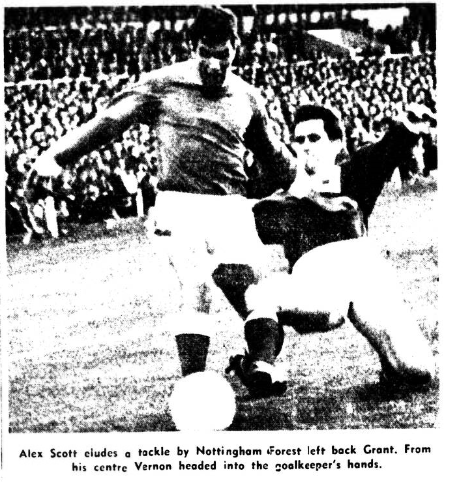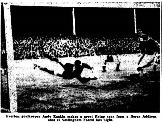 But Hinton settled the game for them with 20 minutes to go, with a brilliant individual goal. There was some hesitancy by Everton’s defence which enabled the winger to move in for a ball which should have been cleared, lob it over Parker’s head with the nearest of flicks and then volley home his shot as the ball dropped. Hard though Everton fought, though they should great spirit to come again, and again their lop-sided attack could not find accurate shooting form. Rankin was Everton’s great performer. He is in brilliant form at the moment and some of his first half saves were break-taking. There had been something of a surprise before the game when Everton left out Stevens for the first time since he joined the club. Gabriel came in at right half and had a good game but I thought Stevens’ endeavor would have been a considerable asset elsewhere in the team, particularly when Forest were so dominating in the first half. Brown also did well, with his goal particularly notable, but apart from Temple and Scott, the remainder of the side were struggling apart from that 20 minutes or so after the interval when they all began to play well. So Everton failed for the first time this season but many other teams are going to experience a similar shaking at the hands, or feet, of this very effective Forest team.