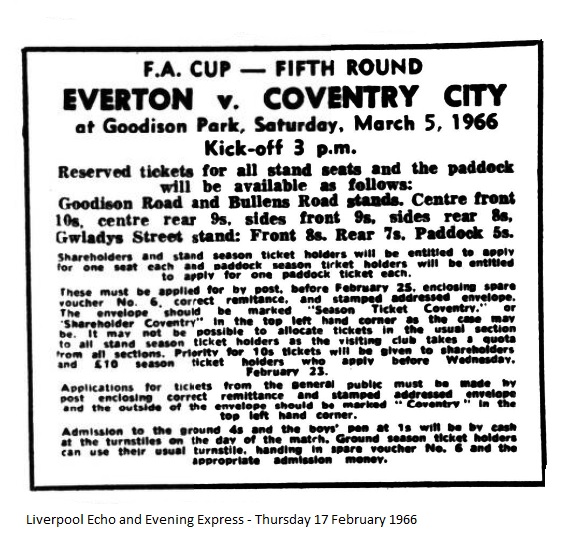 Everton secretary, Bill Dickinson, says that there has been an enormous number of applications for the Cup tie against Coventry City a week to-morrow. These are being dealt with as speedily as possible, but applicants are asked not to telephone the club offices about tickets. Both teams will change their colours for the match. Everton will play in white shirts and black shorts; Coventry City in an all-red strip.