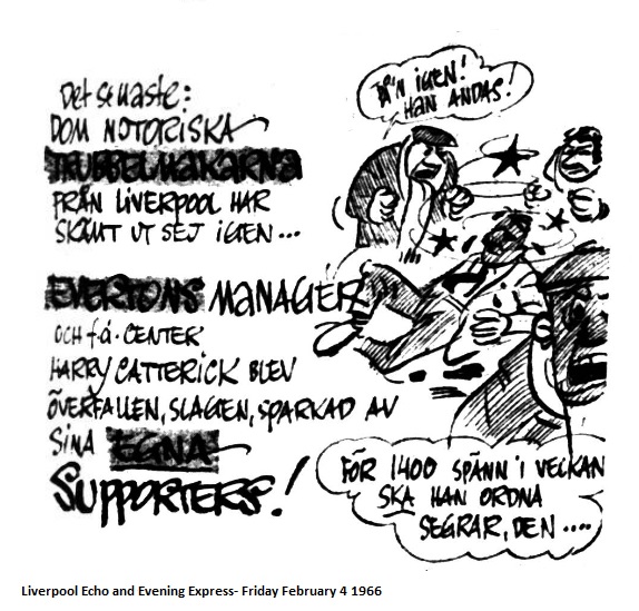 Mr. J.H. Gaskell, of Partille, Sweden, who sends the clippings, comments; You will now realise what sort of reputation Everton and the City of Liverpool are getting following that irresponsible, cowardly action against Mr. Catterick. The caption reads; “The notorious troublemakers from Liverpool have disgraced themselves again. Everton’s manager has been assaulted by his own supporters.
