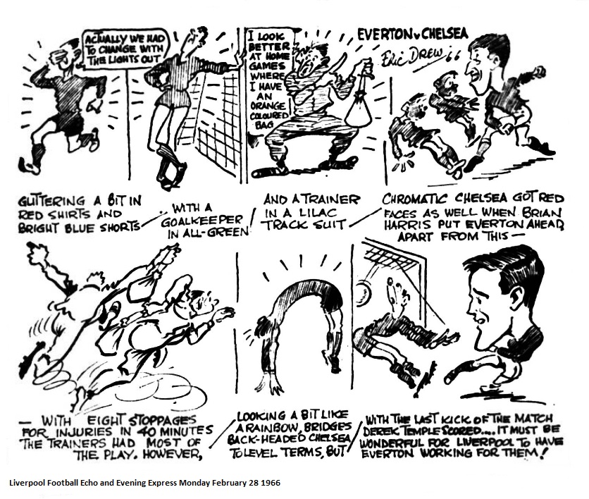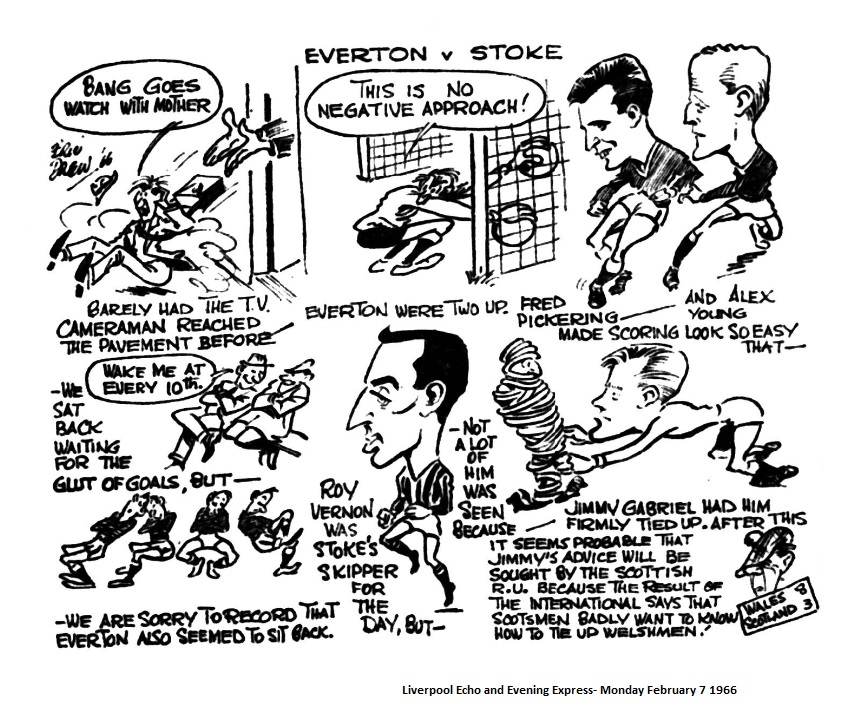 The intriguing thing about the game at Goodison park to-morrow will be the appearance for Stoke City, against his old side, of Roy Vernon. Many followers of Everton deplored his transfer, but when a man is determined on a move what sense is there in trying to keep him against his will? Stoke will be a more testing side than Northampton were a week ago, but the new-mood Everton, dating from the Cup game against Sunderland, should beat them to put up a series of three successive victories. Wasn’t it singular that Leeds United should be the team involved again in a match in which the referee had to take all 22 players from the field for 10 minutes’ cooling-off? Make no mistake, these incidents are given full treatment in the Continental Press and do the image of football here much harm. If you doubt how bad news travels take a look at this cartoon from the Gothernburg evening paper. With no knowledge of Swedish it is possible to translate fairly accurately the opening words of the caption “Dom Notoriskas (TRUBBELMAKARNA fran Liverpool.