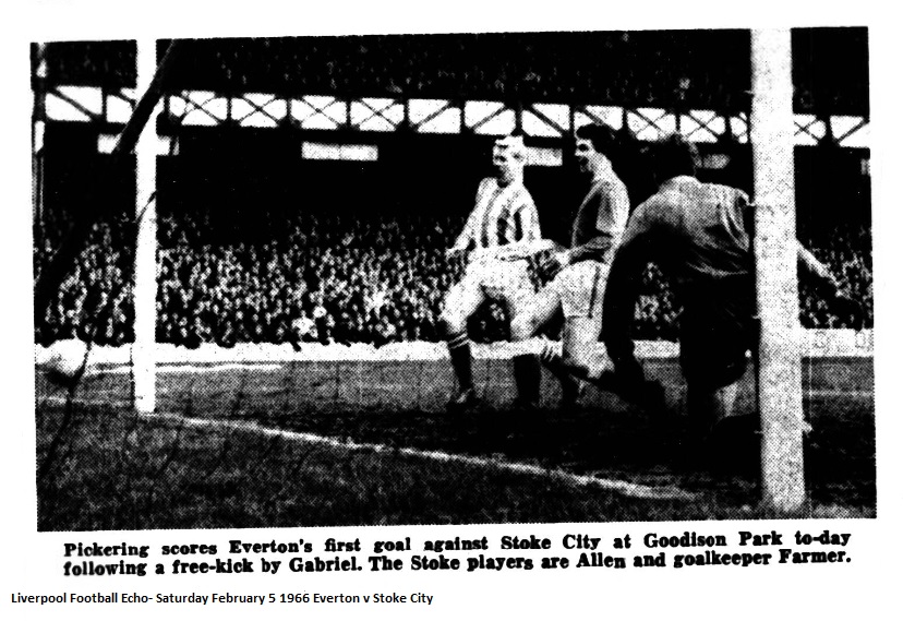Vernon, sportingly received by the crowd, began with a series of defence splitting passes, beautifully delivered, that not only shrieked out a message of danger, but prompted the thought that here was the service Everton lacked. Gabriel’s ability to clamp down on Vernon knocked almost all the cockiness out of the Stoke attack. If his instructions were to take care of Vernon, even at the expense of sacrificing much of his attacking flair then nobody can fault his discharge of duty. It was Gabriel’s well placed free kick, after a foul on Labone, that produced the first goal in nine minutes. An alert and agreeably enterprising Young worried Bloor into mis-heading the ball, and quick as thought, Young swooped. Whether it was a pass or a shot mattered little for as Young swept the ball across goal, in went Pickering to smash it into an open goal. Right from the re-start Temple danced through and found Young with a square pass. Young’s shot was immaculately so that the despairing Farmer never had a hope of reaching it. Not since that memorable night on which Everton trounced Sheffield Wednesday 5-1 has Goodison Park rung to such a crowd appreciation of a team’s efforts. One felt that a side which has suffered all manner of indignity this season had suddenly rediscovered itself. Young was confident and constructive to an impressive degree and Pickering was loitering so obviously with scoring intent.