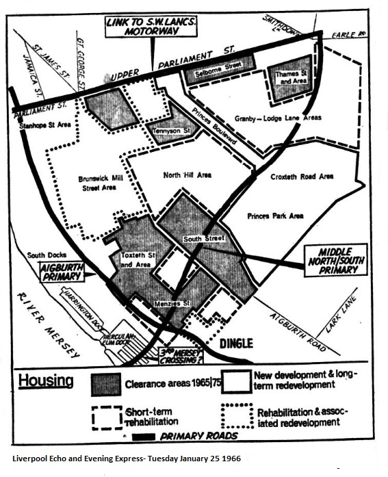 On the other hand it Is recognised that this part of the city, once the home of merchant princes, contains much that is unique and characteristic. Because of this the redevelopment will not be left entirely to the council. "The City Council will obviously carry out most redevelopment, but there is a great need to inject social and architectural variety into the district, by encouraging private enterprise to build houses for sale and letting, and to carry out rehabilitation in certain Instances." stated Mr. Bor. “The building of houses for sale by the council, and by housing societies, to let at cost rents, or for co-operative ownership, should be investigated and encouraged int suitable circumstances." The Toxteth district. extending from Upper Parliament Street to Dingle, including the two great parks of Sefton and Princes, as well as some of the city's worst slums, at the 1961 Census had a population of 76.000, the equivalent of the population of some of the New Towns being built in various parts of the country. Due to redevelopment and other factors this population is expected to have dropped to 56.000 by 1985.