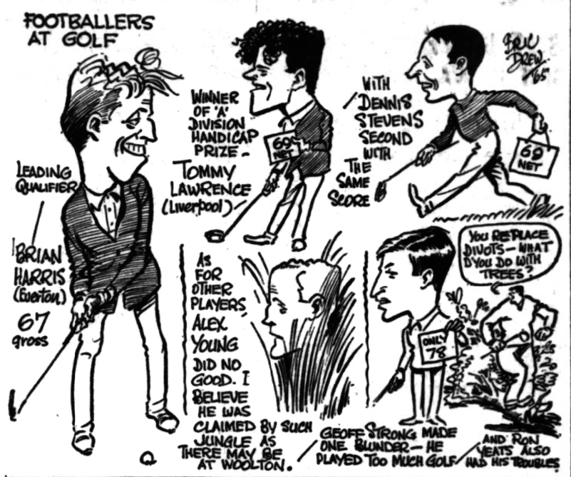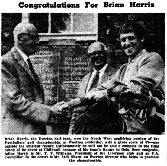Brian Harris, the Everton half-back, hit form with a round of 67 in the qualifying roundfor the professional footballers' golf championship over the Woolton links yesterday. Unhappily, Brian is most likely to be otherwise engaged when the final of the championship takes place, at Childwall, in three weeks’ time. He will be in Oslo with Everton for a friendly match about that time. Several others who qualified yesterday will also have to miss the competition proper because of football commit meets. It was extraordinary how many golfing footballers-or might some of them be footballing golfers--stood on the wrong side of the ball. Left-handers seemed to come uptime after time. If they weren't left-handers, they were people who gripped the club left hand under right-a style favoured by William Ralph Dean , who could hit an iron shot like a professional. The size-or lack of it-in mufti of these great soccer men was unusual, too. Jack Search, himself a fine amateur player in the mid-wars' seasons, fancied his chance physically with any of them. And why not ? He's By a six foot 15-stoner, who would still take a lot of knocking off the ball. A Cup every two. Woolton has changed but little, even if the surrounding area has become much built on, since the far-off days , when Phil Rodgers and Jimmy Bailey used to show their golfing skill at the course. Golfing and football train i ng, according to some managers, does not mix well , but there can be no harm, surely, In this annual get-together of footballing golfers, especially as friendships formed on the links lead to better relations on the field.