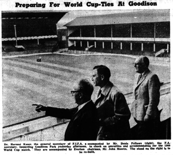 Goodison Park has passed its World Cup examination with honours! Anyone who has seen the ground, trim and immaculate, will hardly be surprised at the excellent impression Everton’s home has created on Dr. Helmut Kaser, secretary general of F.I.F.A who made a tour of inspection yesterday accompanied by Mr. Ken Wilson, chief administrative officer Mr. Denis Follows, F.A. secretary, Mr. Ike Robinson, F.A. vice-president, Everton chairman Mr. John Moores, and members of the board. Five World Cup games are to be played at Goodison Park including a quarter final and a semi-final. To conform with World Cup requirements the pitch has been extended. Although the dressing room accommodation is superb by any standards, Everton intend to install more shower baths. “The work done at Goodison has been admirable and we are delighted by it,” said Dr. Kaser. “We are completely satisfied with everything we have seen and grateful for the co-operation we have received from Mr. Moores and his colleagues. After seeing the dressing rooms, medical room and stands the deputation inspected the Press centre which is to be established in the Supporters’ Club premises in City Road. They were informed that arrangements are being made for the installation on the ground of a scoreboard, on which will be recorded details of all other World Cup matches being played simultaneously with those at Goodison Park, so that the crowds will be given a complete picture. The party also sent some time at Hillsborough and Middlesbrough and today Dr. Kaser goes to Villa Park, before returning to Zurich. Mr. Follows commented; “If nothing more was done than the building of the footbridges over the railway at Old Trafford and the gymnasium behind the north stand at Hillsborough, it would all be worthwhile. “Every big cup in England should have a large indoor training centre. The ordinary pitch is unsuitable from November to February, from the point of view of developing a player’s basic skills, and on this point, I feel that compared with the Continent we are sadly lacking.”