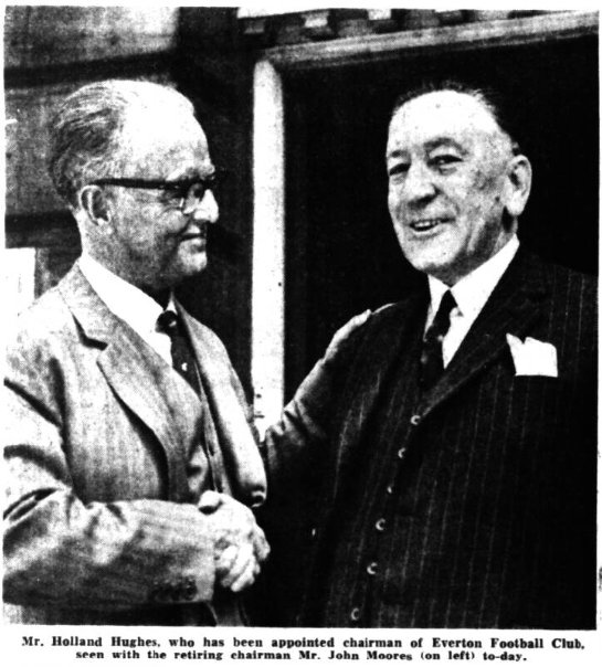 Everton have a new chairman. Little more than twelve hours after hearing Mr. John Moores announce his resignation, the directors Mr. Moores with them, held a special meeting and named Mr. Holland Hughes as his successor, a choice which had been generally expected. And for the first time for five years the club also has a vice-chairman, Mr. Jack Sharp son of the former Everton and England footballer and Lancashire and England cricketer. Mr. Holland Hughes who is a senior partner in a leading Liverpool firm of solicitors has been close business associate of Mr. Moores for a long time and in 1958 was president of the Law Society of Liverpool. His election as chairman was not unexpected because he has been chairman of the club’s finance committee and acted as Everton’s leading spokesman whenever Mr. Moores was away on business or on holiday. Mr. Sharp, who has been an Everton director since July 1946, actually takes over the position he held in 1959 when Fred Micklesfield was elected chairman. When Mr. Moores took over as chairman the position of vice-chairman was not filled and has been vacant until yesterday. Mr. Sharp a former captain of Woolton Golf Club, won the golf competition for football club directors over his home course last Monday. Mr. Hughes said last night “I am conscious of the great responsibility which falls upon me to following such a great chairman as Mr. Moores, but I am given confidence by the knowledge that I have the full support of all my colleagues, manager Harry Catterick and all his staff.