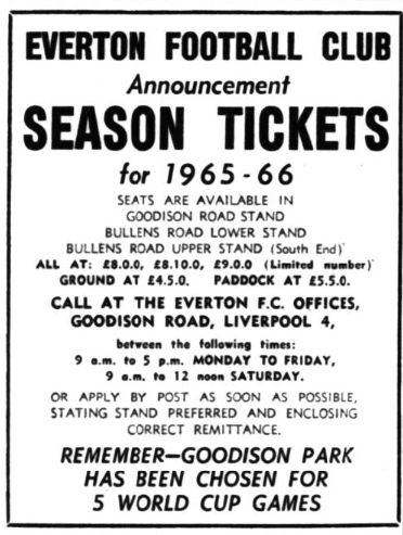 All the grade two stand seating for four of the World Cup matches to be played at Goodison Park next summer have been disposed of. The season ticket rate for them was £4 15s. County F.A’s season ticket holders and applications from foreign F.A’s had priority for these tickets. A special office has been set up at Goodison Park to deal with applications for grade one seats, sale of which began officially this morning. While the demand for these at White City, London, box office headquarters of the tournament, was very heavy, Mr. Bill Dickinson, the Everton secretary, said to-day that demands at Everton were only “steady.” As no tickets will be available for actual distribution for many months, for reasons of security intending purchasers are advised that no personal applications are being dealt with at any of the centres. All applications, accompanied by cheques or postal orders, should be made by post and receipts-vouchers for the amounts enclosed will be despatched as soon as the World Cup organisation staff can deal with the mass of mail already received.