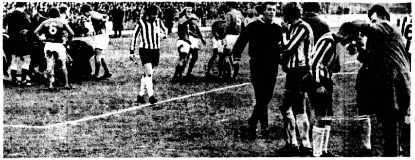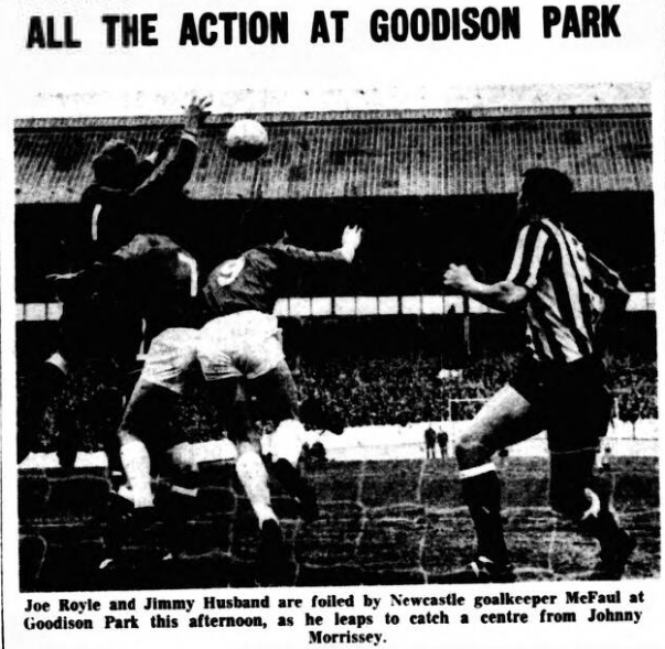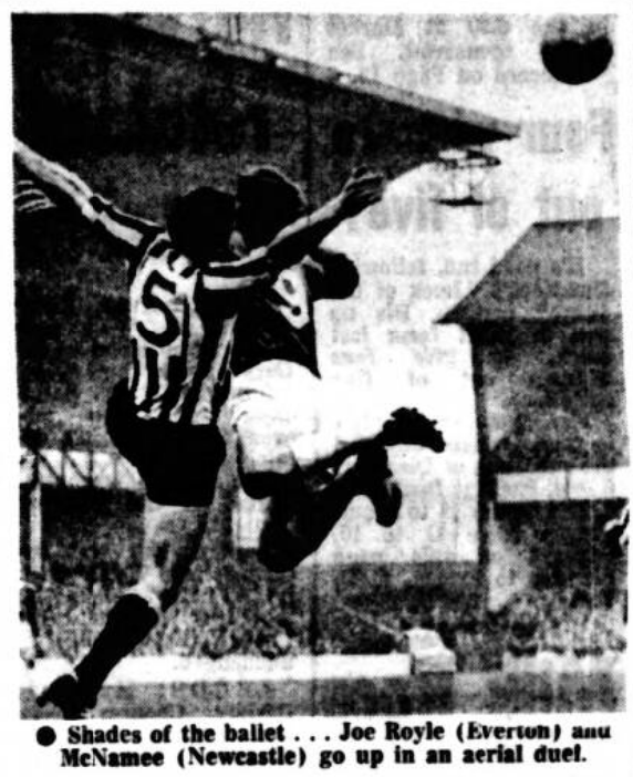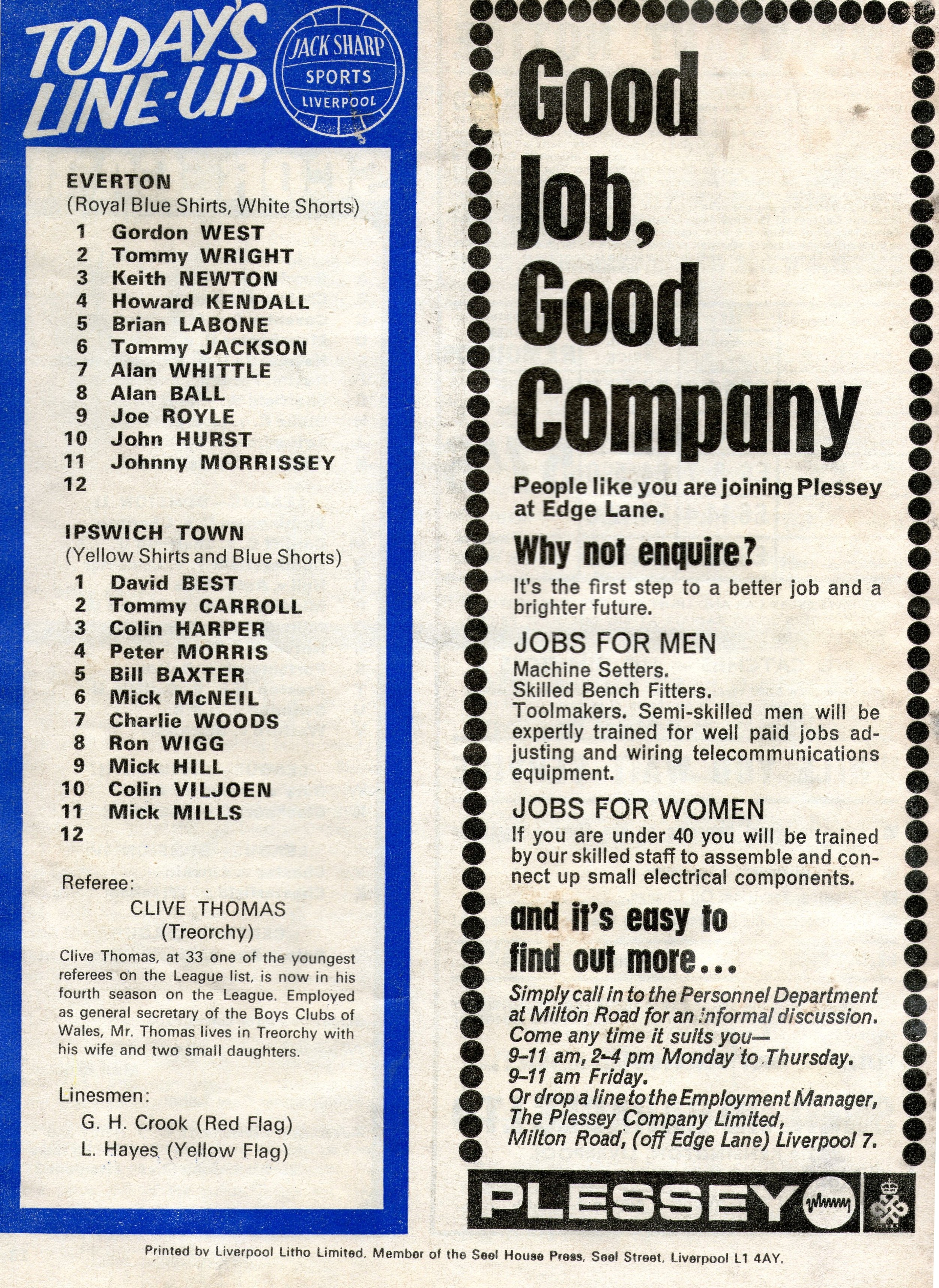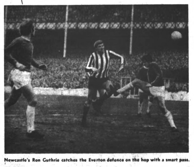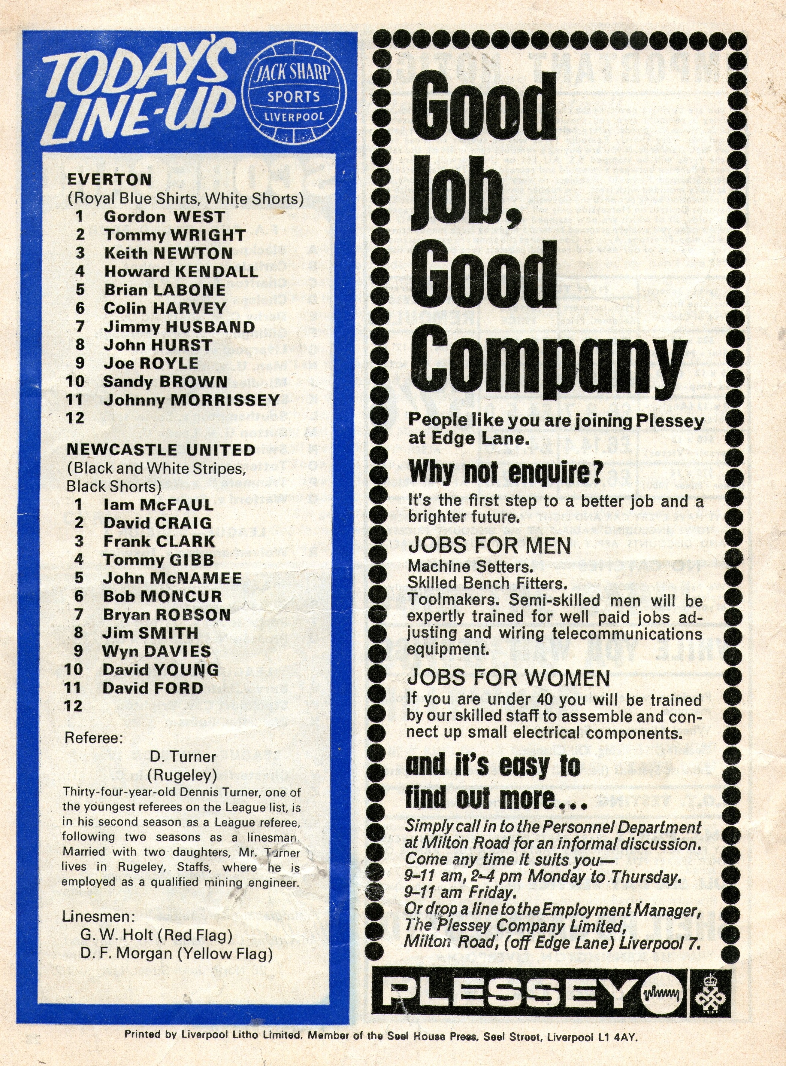 Line-up;- Everton; West; Wright, Newton; Kendall, Labone, Harvey; Husband, Whittle, Royle, Hurst, Morrissey, Sub; brown. Newcastle; McFaul; Craig, Clark; Gibb, McNamee, Moncur; Robson, Smith, Davies, Guthrie, Ford. Sub; Arentoft. Referee; Mr. D. Turner (Rugeley).