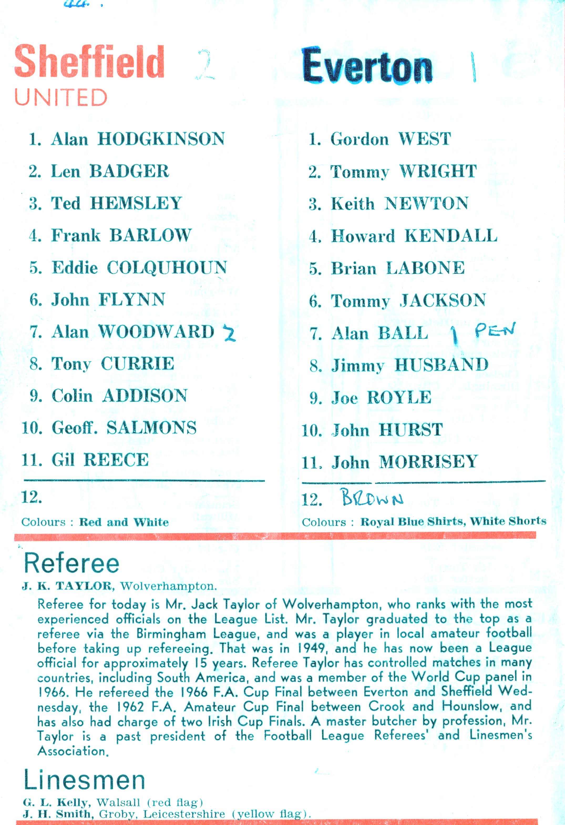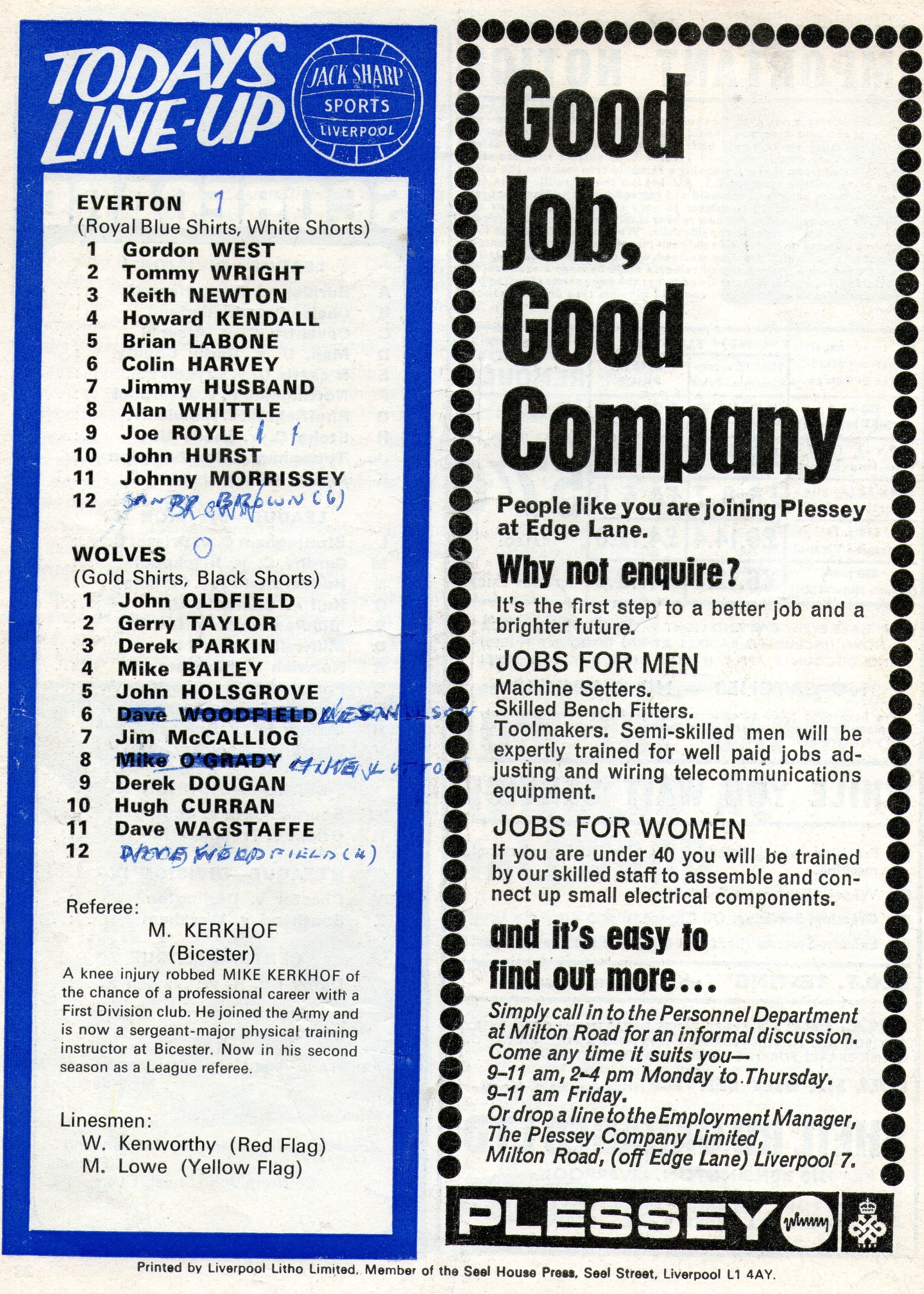 Line-up;- Everton; West; Wright, Newton; Kendall, Labone, Harvey; Husband, Whittle, Royle, Hurst, Morrissey, Sub; Brown. Wolves; - Oldfield; Taylor, Parkin; Bailey, Holsgrove, Wilson; McCalloig, Lutton, Dougan, Curran, Wagstaffe, Sub; Woodfield. Referee; Mr. M. Kerkhot (Bicester).