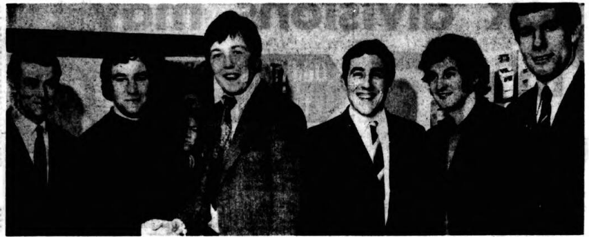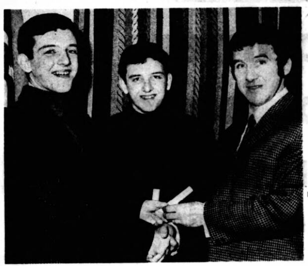 Everton star Johnny Morrissey last night presented gold medal awards of the Amateur Skimming Association to members of the swimming section of the 19th Aintree Scout Group. Two recipients were the 15-vears-old Swift twins, Paul (left) and Phillip, seen here receiving their awards.