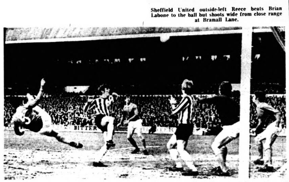 Playing direct, accurate football, based on a strong defensive display which kept Everton's attacking threats down to a minimum, United put tremendous pressure on the Everton defence. The impressive Woodward, always a danger with his speed and thrusting runs down the right, made both goals. He beat Brown, who substituted for the injured Wright, pulled the ball to his left foot and centred for left winger Reece to run 15 yards through a motionless Everton defence and bullet a header put West for the equaliser. Ten minutes from the end. Labone had to come far out to tackle Woodward, but the winger swept the ball around him, centred and Addison hardly had to move before putting his header well away from West. They were perfectly taken goals. For each goal. Newton and Hurst failed to challenge effectively. The crosses were too far out for West to come out to intercept, but both goals pin-pointed the indecision and lack of cohesion among Everton's back four