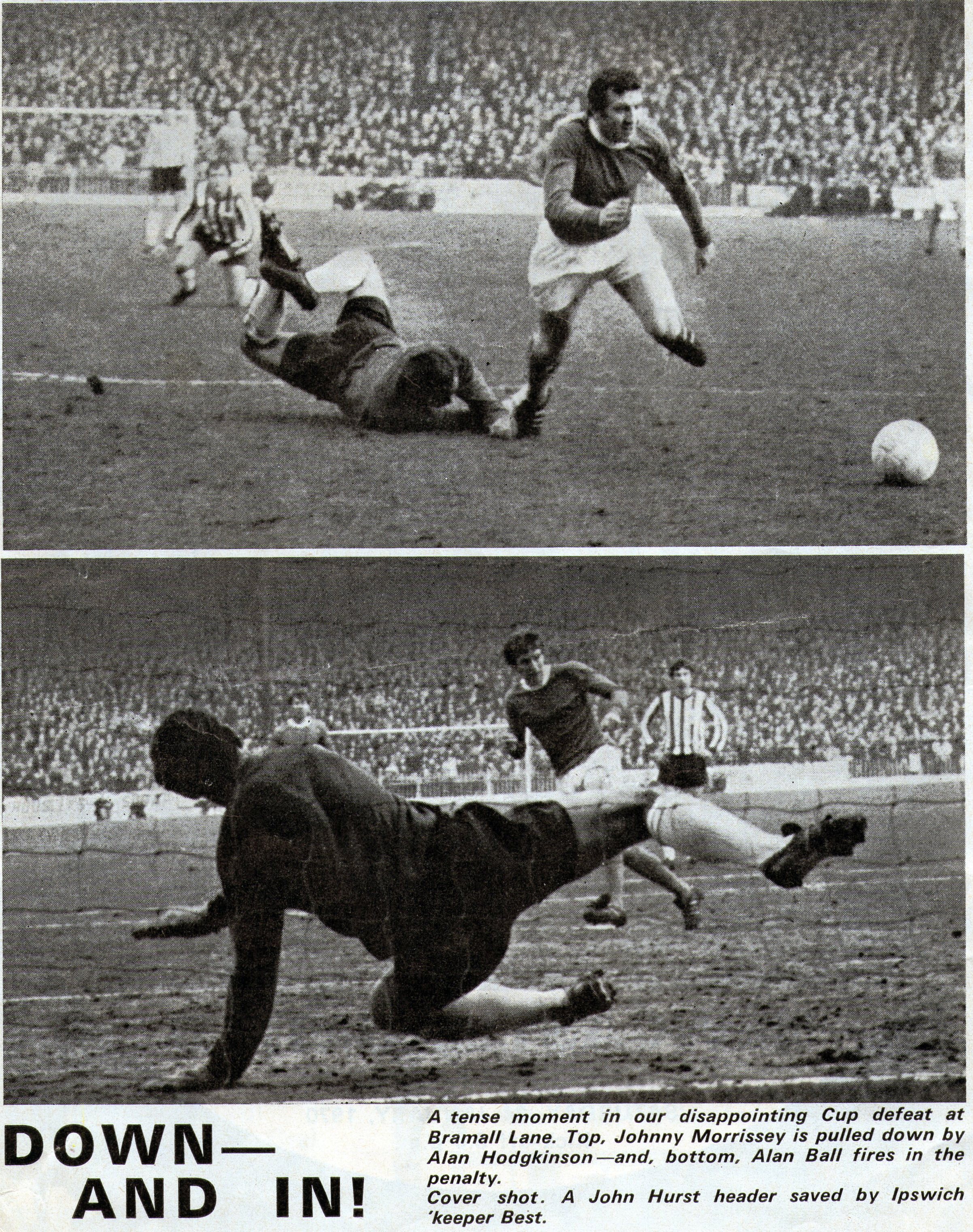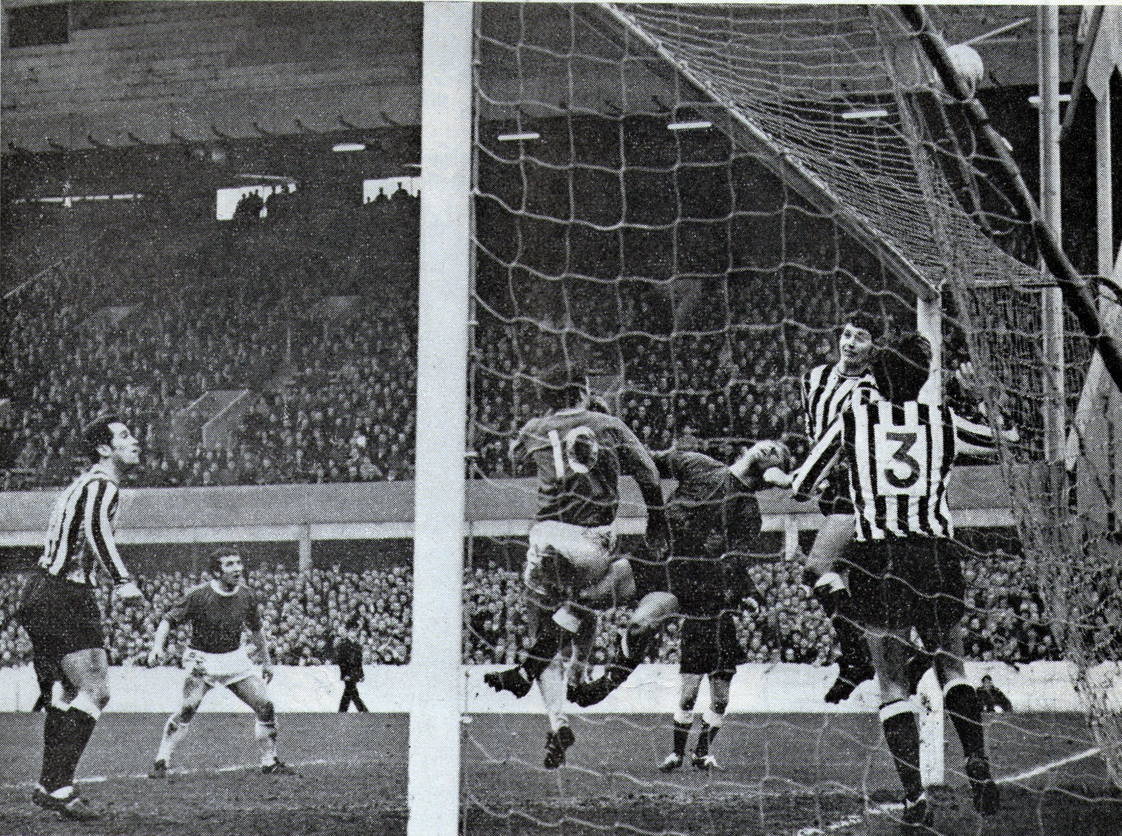 Everton are out of the F.A Cup. The League leaders, bidding to reach Wembley for the third time in four years, were knocked out at the first hurdle in their tie against second Division promotion candidates Sheffield United at Bramall Lane. So, for the Blues, it’s back to the League…and concentration on winning the title. Line Up; Sheffield United; Hodgkinson; Badger, Hemsley; Barlow, Colquhoun, Flynn; Woodward, Currie, Addison, Salmonds, Reece, Sub Tudor. Everton; West; Wright, Newton; Kendall, Labone, Jackson; Whittle, Ball, Royle, Hurst, Morrissey. Sub Brown. Referee; Mr. J.K. Taylor (Wolverhampton). It was a cup-tie in true tradition. A penalty by Ball gave Everton a first half lead, but Reece equalized shortly after the interval. Ten minutes from the end Addison headed a great goal. Whittle and Addison were just offside in quick succession as both teams opened up in lively fashion, with the ball bouncing unpredictably on the firm surface. It was Everton’s goal which nearly fell after five minutes. Addison brought the ball round Hurst and from his cross West could only push it on to the face of the cross-bar. As it bounced down Reece got his foot to the ball and deflected it just wide. United set up a tremendous assault on the Everton goal. As Newton slipped Woodward raced through the Everton defence and hit a tremendous shot from 20 yards which beat West and hit the crossbar to bounce out. Flynn who had been marking Ball closely turned his attention to Royle and fouled the Everton centre forward with a tackle which brought a warning from Referee Taylor. From the free kick Everton set up a furious attack on the United goal, Hodgkinson punching clear from Ball’s centre just as Hurst was moving in to make his header. Woodward’s pace was the major threat to Everton and he was giving Newton a testing time. Ball was working even harder than usual to get the Everton attack moving and he almost succeeded in breaking through in a link up with Royal and Jackson. United’s first time methods looked more effective, yet one of the best chances so far came to Whittle. Colquhoun only partially cleared a Kendall centre and the ball came out to Whittle whose first time shot swung well wide. After all the excitement in the Everton goalmouth the crunch came at the other end, Everton taking the lead after 17 minutes with from a penalty. Badger mistimed a clearance straight to Morrissey, who broke clear, took the ball round Hodkinson who brought him down with a rugby tackle. After two successive penalty misses by Royle in recent games, it was Ball who took the spot kick. He sent Hodgkinson diving to his left and side-footed the ball into the opposite corner. Everton seemed to have taken some of the early sting out of the United attack. Ball was everywhere, putting on a dominating display as Everton began to take over the running Whittle came close to picking up a couple of flicked headers from Royle and United now seemed to have lost all their earlier rhythm and drive. After West had made a fine catch from a centre by Badger, Everton broke away and Ball sent a superb 40-yards crossfield pass to Royle, who took his shot a little too quickly and sent it across the goal-face. United came again thanks to Woodward, easily their most impressive forward. He took a short pass from Barlow, cut inside and hit a low left foot shot which West turned round the post with a full length dive. After 35 minutes Wright was carried off on a stretcher after clashing heads with Reece in which the Everton player suffered a bad gash over his right eye. Brown substituted immediately. Reece only took a minor knock and played on. Brown went to left back and Newton to his best position on the right. Everton were saved by the bar crossbar for the third time so far, when a free kick by Badger, Curre prodded the ball over West but it hit the woodwork. After Whittle had been fouled by Hemsley, Ball nearly got a second goal from the free kick. It was a real banana effort but Hodgkinson moved quickly across the goalmouth and turned the ball over for a corner.