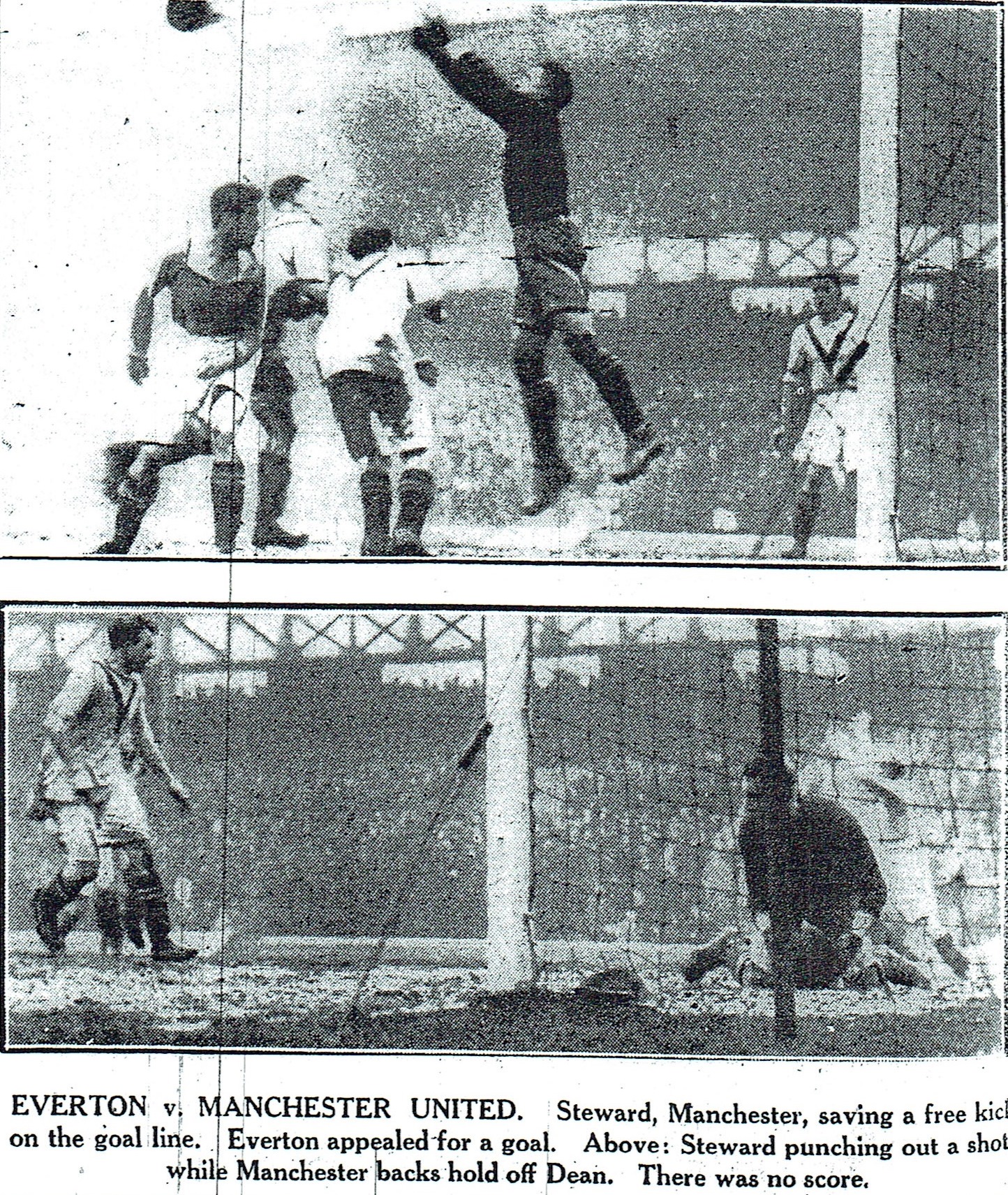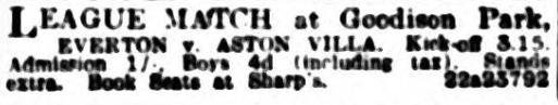 After a shaky start Villa settled down to play a useful game in which they carried all their guns aft and none forward. The two light-haired defenders Bowen and Mort, tackled dean sternly, each making several brilliant and showry clearances in the danger zone. However, none could dent their valuable work or that of Talbot in Dr. Milne's position at centre half. Cook the former Huddersfield Town centre, who played his thirteenth game for Villa, was the best of the visiting attack, being clever in his dribbling. Support from the inside positions was not forthcoming, otherwise he would not have had a blank day –in unusual happening for this player, who his scored in all but three of his games for his new team. Teams : - Everton: - Taylor goal, Cressewell, and O'Donnell, backs, Kelly, Hart (captain), Virr, half-backs, Irvine, Forshaw, Dean, Weldon, and Troup, forwards. Aston Villa: - Jackson, goal, Bowen, and Mort, backs, Kingston, and Talbot, half-backs, Moss, York, Stephenson, Cook, Walker, and Dorrett, forwards.