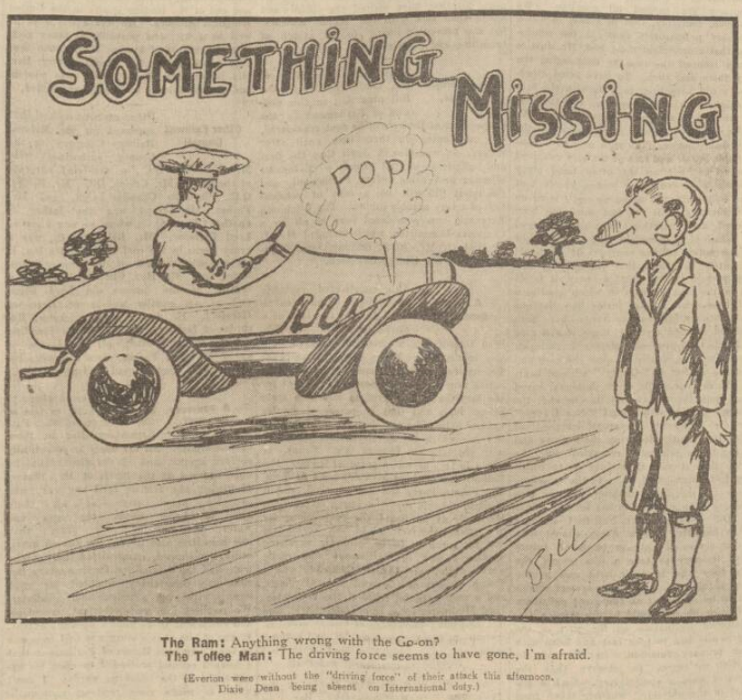 Carr, by fouling Weldon, gave Everton a free kick, and O’Donnell, who took the free kick, gave Olney a powerful drive to turn over the bar, and although Irvine had to overcome a trip, he managed to get in a shot which Olney saved. It had been a good solid well-fought game, and Everton had gained a valuable point mainly through their defence. Final; Derby County 0, Everton 0.