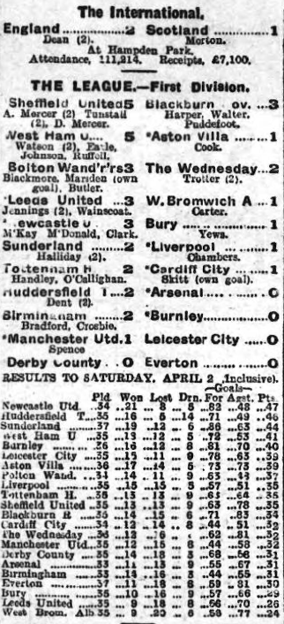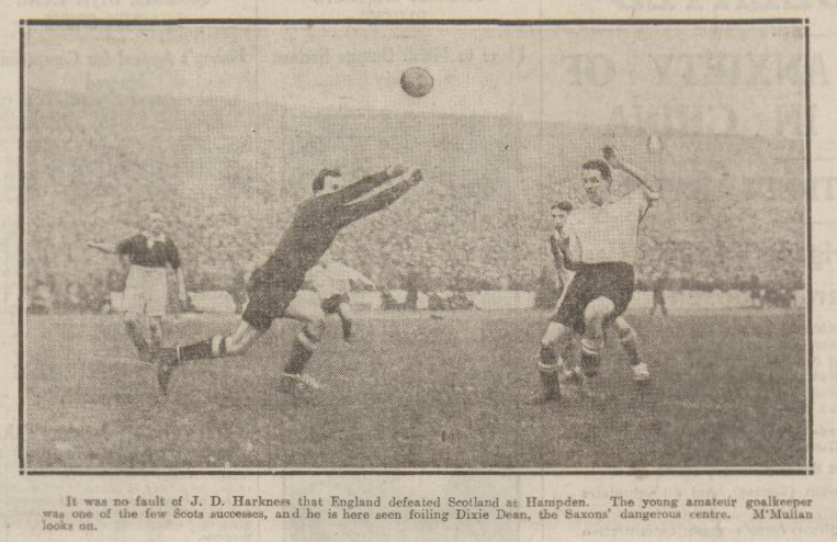 England beat Scotland by 2 goals to 1 at Hampden Park on Saturday in front of 111,214 people paying £7100. Mereseyside enthusiasts rejoice to know that Dean, the Everton centre-forward justified the lavish praise, which has been showered upon him since he left Tranmere Rovers to make rapid progress at Goodison Park. For a player who is only just twenty to score two goals at a critical period of an important game such as that at Hampton Park shows that he has the temperament and the ability for big occasions. No English centre forward had scored against Scotland since Watson netted in 1923, and only two English forwards had previously obtained two goals since 1900-Kelly in 1920 and Wall in 1909.