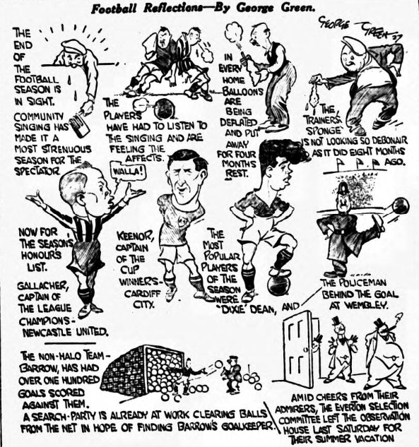 Irvine made an overhead kick that nearly put the cat among the pigeons. It was its unexpectedness that surprised and when Farquharson and Dean went for the ball the ‘keeper gave a corner and nearly a goal. A little boy created an awkward position when he ran on to the field, and stopped the ball from going out of play, Weldon was not far out with a good effort. Blackburn saved a certainly when he flung himself in front of the ball just as Dean was about to shoot from six yards range. Final; Cardiff City 1, Everton 0.