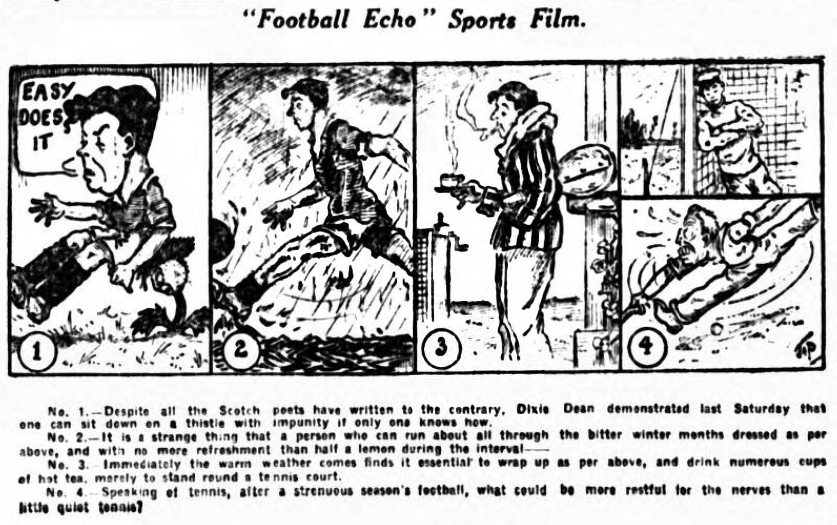 Dean (30 seconds), Walker (40 minutes), and a repetition of the scoring at the seventy fifth and eightieth minutes –that was the score sheet. Dean's first goal created surprise, for Cook, who kicked off, and Mort were the only Villa players who touched the ball. Walker's first was a typical Villa scored in a period when Villa played their usual football. They have rarely scored in the manner employed by Dean, and in their equalising point the ball was criss-crossed about the field with fine accuracy until Walker catching the ball on the half-turn finished off the movement with a fine shot. Hart crossed swords with walker on many occasions and although his passing often left much to be desired Hart fully balanced this defect by his general work, Kelly and Virr were as useful as Hart, this being Everton's best line. The forwards with two exceptions, Weldon (hurt) and Forshaw, were little less effective being a great improvement on the Bolton game. Behind was unsteadiness quite unexpected from men such as Taylor and Cresswell. O'Donnell has tempered down his play and ideas and a distinct improvement was noticeable. Dean was lucky to score a second gaol because Jackson evidently thought his badly kicked shot would screw outside. England's centre-forward had previously missed an easy chance.