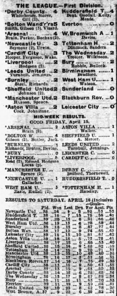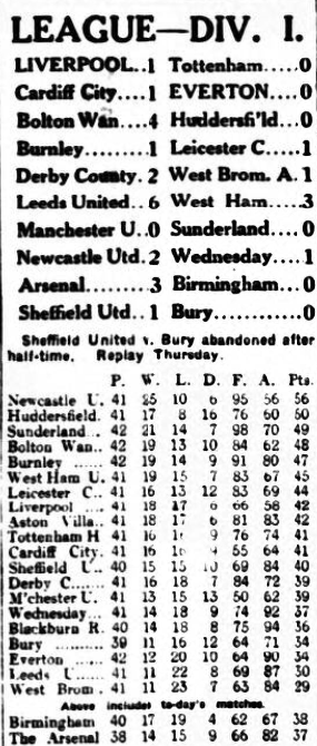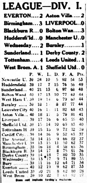 Everton remain in Division 1, for another season, at least, and although they are fortunate to be thus placed they must be congratulated on their evading the relegation bogey after having looked certain to fall from high estate for the first time. They have suffered the brunt of everyone’s criticism, and while their present position is due mainly to Leeds United’s ill-luck there is no doubt that our relegation representative have pulled together wonderfully. On Saturday, Aston Villa; 22 pounds bonus money; and Everton’s natural inducement to play hard in view of a million to one chance saving Leeds, were responsible for Goodison’s large attendance being well interested by what must be considered a good game in view of the variable ground and an awkward wind. Everton were strong at half-back, weak behind, and, apart from Weldon and Forshaw, moderately good at forward. Dean and Walker each scored two goals, the first of both being as well worked as one could wish to see. Dean’s was after 30 seconds, and the only Villa player to touch the ball were Cook, who kicked-off, and Mort, who later with Bowen made two showy, yet worth-while clearances in the danger zone. Irvine and Troup were the best forwards, Dean spoiling a fairly good display by missing a fin chance at a vital point. Villa light of other days will not last them much longer. Walker was inclined to over dribble, Dorrell and York never found their right form, and only Cook was forceful. Talbot was a fine half-back –all “wings and legs,” but capable of holding Dean.