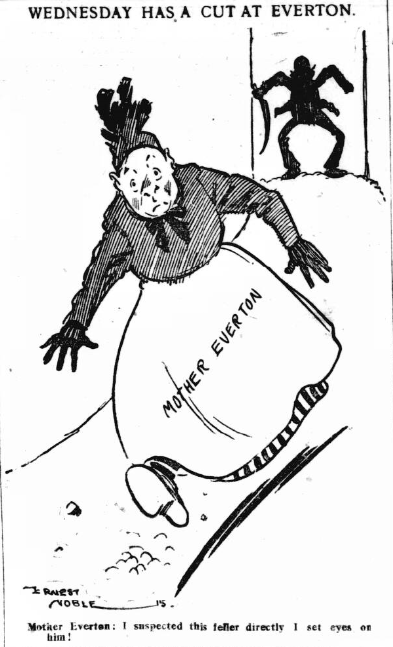 The weather was rather dismal at Goodison Park today, the ground being very heavy and slippery, and there were not more than about 10,000 spectators present at the start. Chedgzoy, who was injured yesterday, was unable to play, and Palmer took his place, otherwise the team was unchanged. On the Wednesday side McSkimming filled the centre half position vice Parkes, and Bentley appeared at left half. The teams lined out as follows:- Everton: - Fern goal, Thompson, and Simpson, backs, Fleetwood, Galt (captain), and Grenyer half-backs, Palmer Kirsopp, Parker, Clennell, and Harrison, forwards. Sheffield Wednesday: - Davison, goal, Spoor, and Blair backs, Brittleton, McSkimming, and Bentley, half-backs, Kirkman, Capper, McLean Wilson, and Robertson, forwards. Referee H.H. Taylor. Everton were the first to attack. Clennell was rather slow in taking a pass from Kirsopp, but his centre to Harrison was promptly returned, and Palmer next placed in front, Davison being just in time to first always before being rushed by Kirsopp. The ground was so treacherous, inches thick in mud in parts, and accurate play was hardly to be expected. The players, however, were not lacking in keenness, especially the Sheffield men. Their defence continued to be hard pressed, and Davison made another neat save from a header by Kirsopp. Kirkham then got in a clever run. After beating Grenyer he placed in front for Thomson to clear. Kirkham scored for Sheffield. Sheffield came again, Mclean getting the better of Thompson in strongly, Fern, who was standing a yard or two outside his goal, saving at the expense of a corner. Once having got into their stride, the Sheffield forwards were every persistent, and Galt was only just in time to check a dangerous run by McLean. Wilson next got in a hard drive, which went a yard wide.