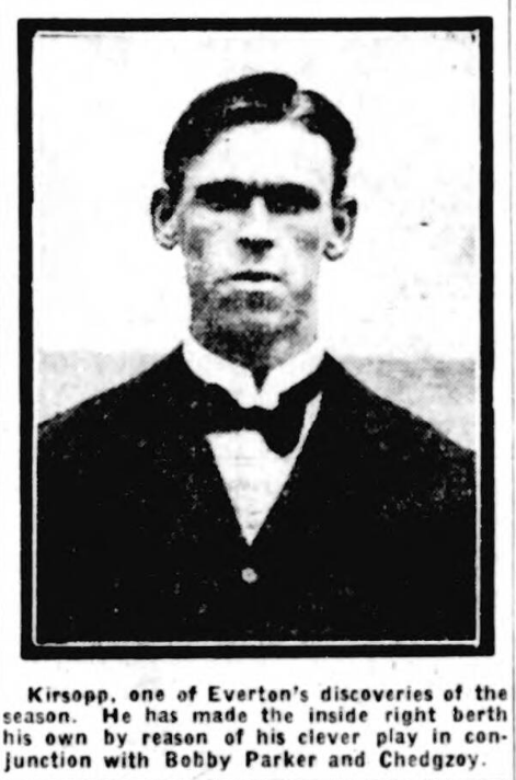 Some real good play was witnessed at Goodison Park, where Wednesday well deserved the win gained by a brilliant goal shot by Kirkham 15 minutes after the start. Everton gave the better display in the early stages, but met a great defence, and after the interval the result was never in doubt. Davison was prone to hold on to the ball rather too long instead of clearing, but this was the only criticism one could direct against the Wednesday defence. Harrison and Palmer, especially the former, centred the ball with fine accuracy, and Kirsopp and Clennell were smart in their dribbling, but in these anxious times the Wednesday defence never faltered. Early on Davison saved at the expense of a corner from Kirsopp, who headed in from a fine centre by Palmer, and the goalkeeper and Kirsopp were again conspicuous in a similar manner, this time from a centre by Harrison.