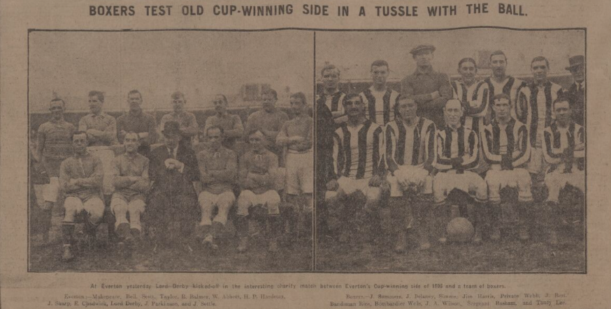 The Liverpool public last night stood by the efforts of Mr. J. Sharp, the well-known cricketer and former footballer, and made his venture's a great success. The game arranged for the Everton ground was an attractive one, inasmuch as the spectators had a chance to see some well-known boxers, who are little known footballers, although they play the game in minor circles, and also a chance to revive memories of by gone days. Everton's Cup Winning team of 1906 being chosen as near as possible. Notable absentees were “Sandy” Young, who scored the winning goal at the Crystal Palace against Newcastle United, and Crelley, Parkinson the old Liverpool centre took Young's place and among the Everton ranks one found veterans in John Bell and Edgar Chadwick. Mr J. A. Wilson of the stadium was responsible for the good the Boxers turned out, and, all told the match was a big success, and the funds of the Sailors and Soldiers Association will benefit to a considerable extent as the result of this game. The crowd numbered some 12,000, and the weather was beautifully fine. The referee was Everton's present captain (James Galt) the linesmen were J.T. Tyldesley and A.N. Other, and Lord Derby kicked off. Teams: - Everton: - Scott, goal, Bell, and W. Balmer backs, Makepeace, Taylor, and Abbott, half-backs, Sharp, E. Chadwick, Parkinson, Settle, and H.P. Hardman, forwards. Boxers: - G. Sims, goal, J.A. Wilson and Bankman, backs, Rice, J. Webb, and J. Harris, half-backs, Best, J. Summers (Bomb), Wells, Tancy Lee, Delsney, and Serg Basham, forward.