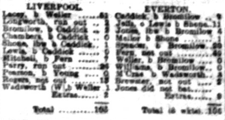 There were some interesting incidents in the match between Everton and Liverpool footballers at the Wavertree club ground, where Everton players had in the previous year beaten the Liverpool player. Much amusement was caused when Wadsworth appeared at the wicket in a silk hat, which he finds very inconvent for rungetting. Lacey give a capital display with the bat and his 51 included five four's, put for vigorous batting parry was an easy winner for he also got five four's in his 24. Liverpool whose total reached 103, looked to have a capital chance of reversing last season result, for Everton lost seven wickets for 67, then McCrea joined fern and a separation was not effected till the total had reached 94. Everton success was undoubtedly due to the patient and steady play of fern, whose partnership with McCrea added 27, of which the latter contributed 3. Fern with the assistance of Brewster went on to win the game, with a splendid cut to the boundary for 4. Fern stated his effort with the total at 34 for four and was not out, with 49 when the end came.