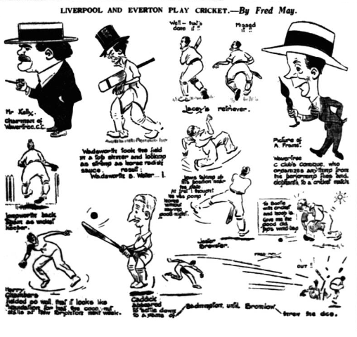 There were some interesting incidents in the match between the Liverpool and Everton footballers at the Wavertree Club’s ground, where Everton players had in the previous year beaten the Liverpool players. Much amusement was caused when Wadsworth appeared at the wicket in a silk hat, which he found very inconvenient for run-getting. Lacey gave a capital display with the bat, and his 51 included five 4’s but for vigorous hitting Parry was an easy winner, for he also got five 4’s in his 24. Liverpool, whose total reached 105, looked to have a capital chance of reversing last season’s result, for Everton lost seven wickets for 67. Then McGrae joined Fern, and a separation was not affected till the total had reached 94. Everton’s success was undoubtedly due to the patient and steady play of Fern, whose partnership with McGrae added 27, of which the latter contributed 3. Fern, with the assistance of Brewster, went on to win the game with a splendid out to the boundary for 4. Fern started his fine effort with the total at 34 for four, and was not out 49 when the end came. Scores;-