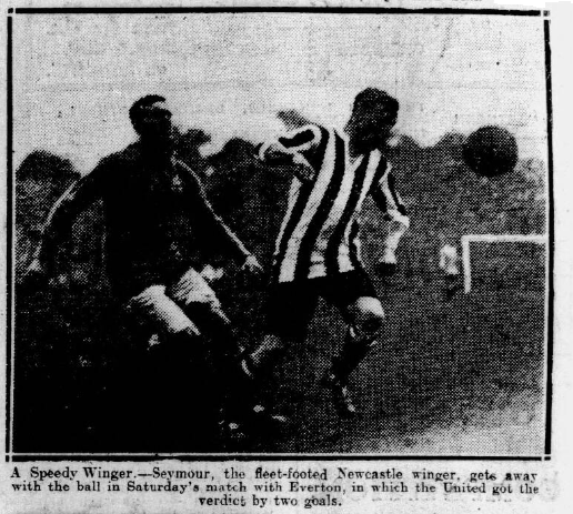 As was to be expected, the opening game of the season, especially between such old rivals, created great interest in the Tyneside capital. There were 50,000 people present to witness the combat. When Brewster led his men into the arena the visitors met with a cordial cheer, which was renewed when the Magpies fluttered on to the field. Everton won the toss, but a slight breeze was of little advantage to either side. Newcastle down the hill, and Seymour, dashing along the wing, had Peacock beaten when Downs came to the rescue. Everton at once returned the compliment with a breakaway on the part of Harrison and Williams, but McIntosh checked cleverly. The visitors returned on the left, and the ball was passed smartly across, but both Irvine and Fazackerley missed it, and the next bit of interest was a brillaint breakaway by J. Low. His square pass was followed by his namesake pressing a corner, but this was cleared after an exciting struggle. Everton were again busy on the left but they were well held by McIntosh and McCracken. It was not long before the United forwards were again hammering at Fern’s charge, and a long drive by Harris was missed by Brewster, but the backs were on the lookout, and the game veered round for a time in favour of Everton.