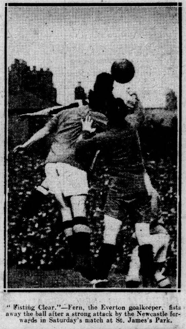 The Tynesiders then moved along, and Harris centred with such judgement that Seymour hit the post and before Fern could recover himself McDonald netted at close range. This came two minutes after the resumption. For a time after this there was no holding the United, who simply penned the Evertonians in. fern saved a hot one from Harris nimbly, and then Smailes sent the leather flying high over the bar. United proceeded to elaborate their plan of campaign with great dexterity, and from a long drive by McIntosh the home centre just failed to get his third goal home. Good work by Peacock put Jones in possession, but the latter closed and put the ball to Irvine, who had a grand opening, when he allowed himself to be dispossessed. Williams also was at fault when well placed, and subsequently the same old story of Newcastle aggressiveness was renewed. Fern dealt adequately with several fine shots from Harris and his colleagues. Everton eventually raised themselves again, and the front line moved down with distinct cleverness, and Jones sent in a swinging oblique shot which Mutch ran out to clear just as Irvine bumped into him.