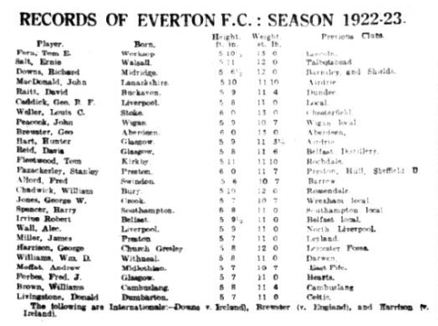 Last season was the most disappointing over experienced by the Everton club, but although there are few changes to record in personnel, the outlook for the coming campaign is regarded more hoperfully. Notable recruits in Raitt, Forbes, and Williams have been signed on during the close season, while a sensational announcement may shortly be made of further additions. David Raitt is a fine stamp of full back from Dundee; Fred Forbes is a typical Scottish centre from the “Hearts” with a good shot in either boot; and W.D. Williams, an inside-left, who comes via Blackburn and Darwen scored 81 goals for the latter club during the past two seasons. The players who have not been retained are Crossley, who has gone to West ham; Yarwood, to Oldham; Fare to Wigan Borough; Garrett and Leddy to Chesterfield; and Leary, to Tranmere Rovers. With a view to encouraging local talent, the directors have taken over a ten-acre field in the neighbourhood and divided it off into playing pitches for junior clubs. The whole is enclosed, and will accommediate 12,000 spectators. This will be the headquarters of the “A” team, who are entered in the Liverpool County Combination. The return of S. Chedgzoy has given great satisfaction to the supporters of the club. He only arrived back from Canada during the week, and appended his signature to the necessary forms on Saturday, when he returned out in a practice game. He had the misfortune to meet with an injury to his ankle in a heavy collision with Macdonald and had to be assisted from the field. A. Grenyer is still unsigned. Mr. W.C. Cuff, the former secretary of the club, has been elected chairman of directors and Harry Makepeace has been re-enagaged as coach. The roll-call is as follows; Players; Birthplace; Position, height and Weight