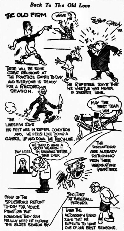 Everton F.C., are fast on their marks with their appointments and arrangements. Mr. Tom McIntosh, their secretary, tells me of many important moves. First, Dixie Dean has been reappointed captain and Jock Thomson his deputy. The club have reduced their Central League prices for the Goodison stand from 1s to 9d in the belief that it will give satisfaction and help their gates. Everton are entertaining the League Management Committee at Scarborough on Friday. These are the team-sheets for the trial games;- Cup Team (Blues);- on the 12th kick-off at 3.15;- Sagar; Cook, Cresswell; Britton, White, Thomson; Geldard, Dunn, Dean, Johnson, Stein. Whites; Coggins; Williams, Jones; Clarke, Gee, Archer; Critchley, McGourty, J. Balmer, (nephew of the pair that helped Everton to win the Cup in 1906- played for collegiate Old Boys last season), J.G. Watson and Turner.