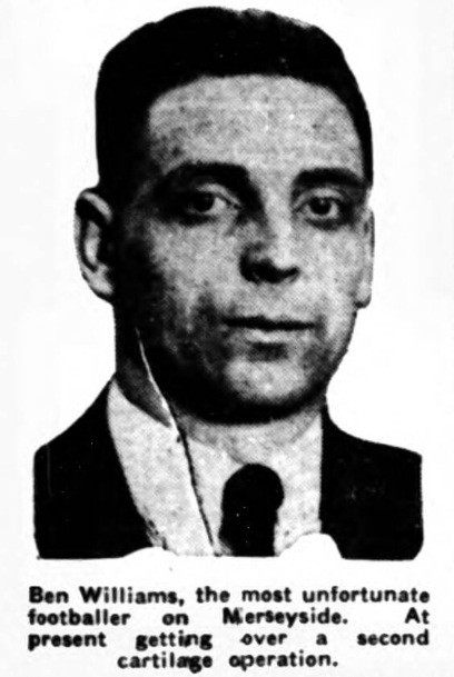 Ben Williams, Everton’s Welsh international full-back, has broken down in training and has gone into a nursing home for another operation on his knee. It will be recalled that Williams was injured on the eve of the Cup-ties last season and was subsequently operated on for cartilage trouble. He did not play again for the first team during the season. This breakdown is a big blow Everton, for Williams was regarded as one the best backs in the country.