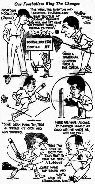 The Bootle cricket round was packed to its utmost last night, when Bootle were opposed by a side of Liverpool and Everton footballers, six being selected from each club. The Liverpool and Everton supporters were in the unusual position of both cheering for the same team and their enthusiasm was undoubtedly whole-hearted at seeing their football favourites again after the summer spelt of idleness. “Bill “Dean was early in the lime-light, for a catch in the slips by the popular Everton captain saw the first Bootle wicket fall. H. S. Brown and .T. R. Williams, however, defied the bowling of Hodgson, Clark, and Gee, until the latter broke up the partnership with an, appeal for lbw against Brown. Clark returned on the attack, and with his first ball dismissed Williams, the Bootle batsman offering an easy catch to Gunson. The footballers were exceptionally keen in the fled and McPherson caught L. Collis behind the wickets, while Dabbs ran in to make a brilliant catch shortly afterwards and A. Cohen was sent back without scoring. Hodgson, who captained the footballers, let Clark and Gee do the bulk of the bowling, but after a spell in the field returned to the attack himself and dismissed W. E. Lewis and L. Lacey with successive deliveries. The eighth wicket fell at 89, but 117 was reached without further loss, at which total Bootle declared after batting two hours. Hodgson took three for 29, Clark three for 38, and Gee two for 21. There will probably be another big crowd to-night when the footballers take their turn with the bat.