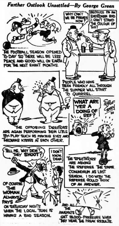 • Advertisement in Evening Express. Practice Match at Goodison Park. Saturday Next, Blues, versus Whites. Kick-off 3.15 p.m. Admission 6d, Boys 3d; Stands Extra. All pay. Full Proceeds to Local Charities.
