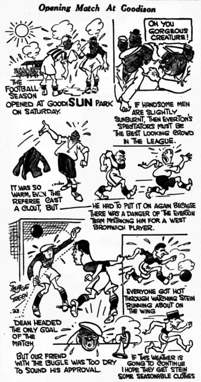 People wearing panamas and straw hats, and without coats and waistcoats, were along the 35000 spectators at Goodison Park, where Everton opened the season with a visit from West Bromwich Albion. Both teams relied on old friends. The referee found it so hot that he removed himself of his coat. Everton: - Sagar, goal; Cook, and Cresswell, backs; Britton, White and Thomson, half-backs; Geldard, Dunn, Dean (captain), Johnson, and Stein, forwards. West Bromwich Albion: - Pearson, goal, Shaw and Trentham, backs; Murphy, Richardson (W.), and Edwards half-backs; Glidden, Carter (V.), Richardson (W.G.), Sandford, and Wood forwards. Referee Mr. W. Walden, (Nottingham).