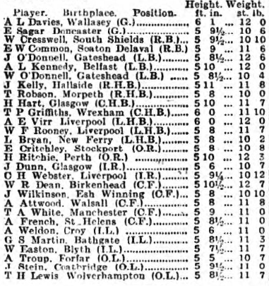 The only new forward signed during the close season is Wilkinson of Newcastle United, who used to deputise for Hughie Gallacher. The only other newcomer is William O'Donnell, brother of Jack O'Donnell. Of the players who were not re-engaged, Hardy has joined Bury, and Meston will be seen on the wing of Tranmere Rovers. Dick Forshaw too, does not appear among the list of players retained. Everton will have their first public practice on Saturday, and the final one on August 21 st . the Following is a list of players engaged for the season; Goal- Davies, Wallasey, height 6ft 1in weight 12st; Sager, Doncaster, 5ft 10ins, 11 st; Backs; Cresswell, South Shields; 5ft 9ins, 11 st 6lbs; Jack O'Donnell Gateshead 5ft 8 and half ins, 12st 6lbs; Kennedy, Belfast, 5ft 10in, 12st; William O'Donnell, Gateshead 5ft 8ins, 10st 12lb. Half-backs; Kelly Hallside, 5ft 11ins, 11 st 8lbs; Griffiths, Wrexham, 6ft 11 st 10lbs; Hart, Glasgow, 5ft 10ins, 11 st 7lbs; Virr, Liverpool, 6ft 12st 8lbs, Bryan Port Sunlight, 5ft 9ins; 10st 11lbs; Rooney, Liverpool, 5ft 8ins; 11 st 7lbs; Lewis, Wolverhampton, 5ft 8 and half ins, 11 st 7lbs; Forwards. Critchley, Stockport, 5ft 8ins; 10st 8lbs; Martin, Bathgate, 5ft 8 and half ins, 11 st 3lbs; Dean, Birkenhead, 5ft 10 and half ins, 12st 8lbs; Weldon, Croy, 5ft 6ins; 11 st ; Troup, Forfar, 5ft 5ins, 10st 7lbs; Ritchie Perth, 5ft 10ins, 12st 3lbs, Wilkinson, Esh Winning, 5ft 6 and half ins, 10st 10lbs, Easton, Blyth, 5ft 7 and half ins, 11 st 7lbs; White, Manchester, 5ft 9ins; 11 st ; Stein, Coatbridge, 5ft 9 ins, 11 st ; Dunn, Glasgow, 5ft 6ins, 10st 7lbs; Webster, Liverpool, 5ft 9ins, 11 st ; Attwood, Wallsall, 5ft 9lbs, 11 st 6lbs.