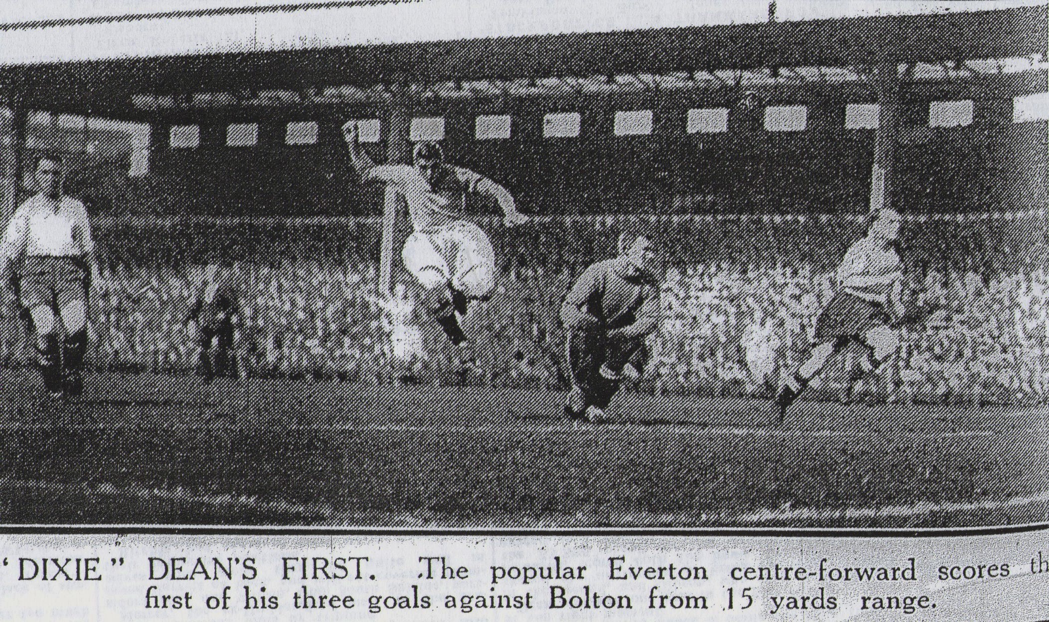 At Goodison Park, in fine weather, before a crowd numbering 35,000.  Blackmore gave Bolton the lead after six minutes, following a corner.  This was against the run of play, but four minute later Dean placed Everton level, and 24 minutes later Dean gave them the lead with a header.  Bolton pressed, and Butler hit the post.  It was a hard, keen game.  Bolton, although facing the sun in the second half, did well, and from Butler’s shot Davies as hurt in saving his goal.  Bolton drew level when O’Donnell let in Butler for the winger to net after 15 minutes.  Stein headed Everton’s third goal after 24 minutes but Gibson levelled the scores on time.  Result; Everton 3, Bolton Wanderers 3.