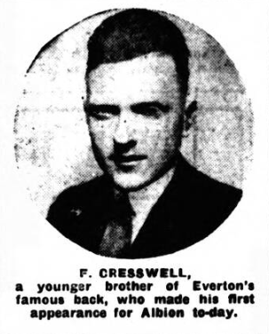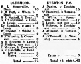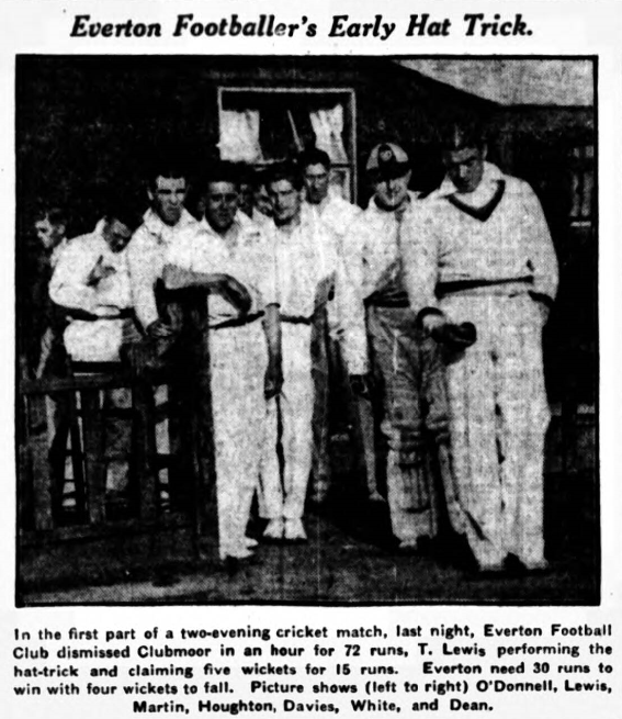 The annual cricket match between Clubmoor and a team of Everton footballers attracted a good crowd at the Maiden-lane enclosure last evening (a collection being taken for the groundsman).  Captain Dean lost the toss, and Clubmoor batted first, R.L. Somerville and J. Duff being opposed to Dixie and Lewis.  Dixie’s first delivery was sent to the boundary by Somerville, but Dean soon got into full swing, and things began to him.  Duff was dismissed at 10.  White making a splendid catch behind the wickets.  Dean’s next success was the clean bowling of Somerville with the score at 18. A “skier” by G. Tomkinson again brought the English centre to the “fore” Lewis first came prominence in the bowling line.  Half the Clubmoor batsmen were out with only 59 on the board, and a further two were sent back without any further score being added, Lewis doing the hat-trick.  Cresswell next had a “do” with the leather, and he also met with success, the next two victims failing to his loot.  Five wickets for 2 runs was no mean performance, and the crowd showed their appreciation.  At 72 the innings closed, being exactly the same total as in the last match.  The Clubmoor innings lasted exactly an hour.  The fielding of the footballers was in category A1.  White proved himself a splendid “wicket-keeper,” keeping the “extra” down to nil.  Lewis claimed five for 15, Dean three for 20, Cresswell two for 8, and Ritchie none for 19.  Play will be resumed this evening at 6.30.