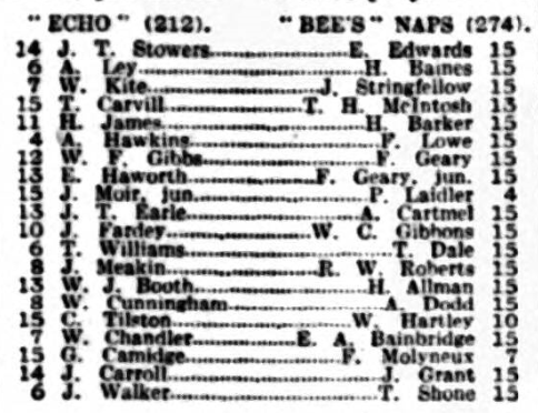 The annual cricket match between Clubmoor and the Everton F.C will take place on Monday and Tuesday evening next, being at 6-30.  The match will be for the groundman’s benefit.  Clubmoor will be selected from; Dr. J. Rumjahn (Captain), J. Harling, R.L. Sommerville, H.L. Nuttall, G.J. Tomkinson, W. Winstanley, C. Simpson, W.D. Getty, W.F. Winship, H. Rowland, W.J. Chester, A.M. Roberts, T.C Williams.
