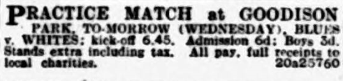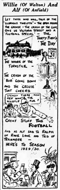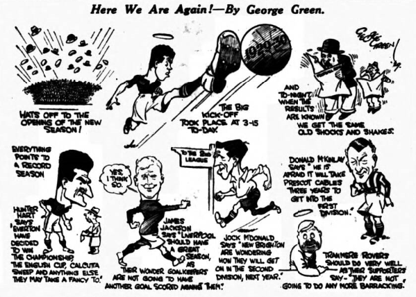 We have the first trial game at Everton, whose ranks will be scanned very seriously by the earnest followers of the Blues.  In their new jerseys Everton hope to strike the winning formation right away; the previous colours always struck me as a trifle drab.  Tomorrow’s trial game means a lump for charity, because Everton have always drawn “big” for these practice games, and the average football enthusiast has been yearning for a sight of the big ball for about three months.  Blues; Davies; Cresswell, J. Donnell; Kelly, Griffiths, Hart; Ritchie, Dunn, Dean, Weldon, Stein.  Whites; Sagar; Common, Kennedy; Robson, White, Rooney; Critchley, Wilkinson, Attwood, Barton, Lewis.