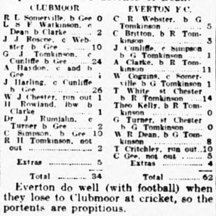 On Monday and Tuesday (6.30 start) the annual meeting will take place. It has been a singular thing that when Clubmoor have beaten Everton at cricket, Everton have won a League Championship! When Everton have mastered Cluhmoor at cricket, they have had a lean football year! For Everton's sake, Clubmoor hope to win again this year, but the game should be tight, as Everton have some first-class cricketers on their books. Clubmoor side is:—Dr. J. Runijahn (rapt.), R. I Sommerville, W. J. Chester, W. Winstanley, L. S. F. Watkinson, J. J. Roscoe, R. H. Tomkinson, C. Simpson, J. Harling, H. Rowland. G. J. Tomkinson.
