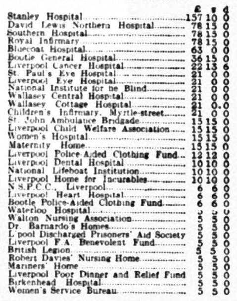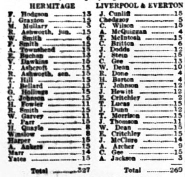 A largo attendance witnessed the bowling match between the Everton and Liverpool Clubs and The Hermitage for the benefit of Dick Johnson, who is very ill. Although the footers were defeated by a margin of 58 points, the majority of them were just as much at home on the green as they are on the football field, and some exciting battles were fought out. Secretary Mclntosh was in form, and defeated his opponent by nine. Dean, Gee, J. Critchley, and J. Stein were also among the winners. Morrison and Lucas each won by the same score (15-11), and the former had the spectators in roars laughter at his antics whilst playing. Results;-