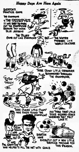 I came away from Everton's first trial match at Goodison Park, last evening with the impression that, barring accidents, Everton will not need to make any alterations in the championship side for the West Bromwich match, which opens the season on August 27. This does not mean that the newcomers to Everton did not come up to expectations. They did –particularly McGourty, the young Scotsman from Patrick Thistle. Here is a boy who with ordinary luck is going to force his way into the first team by sheer merit. Why not now? Well, frankly I should not disturb the front line combination at the moment. It is balanced, clever, and incisive. It has proved successful for two successive seasons. What reason can there be for altering it? Yet one cannot be blind to the fact that McGourlay is worth his place in any Football league side. Lucky Everton to have such talent at call. The two outstanding phases of the game were that the reserves won by 7 goals to 4 after having been 1-4, and that Dean missed the easiest goal scoring chance of his career. The brilliance of the win is emphasized when it is remembered that shortly after half-time the plight of the Whites appeared hopeless. In addition to being three goals in arrears they lost McPherson, their centre half with a twisted knee. Chedgzoy came on as deputy, and within 15 minutes the quick-shooting Whites' attack had piled on no fewer than six goals. The Blues had been the better combination up to the time that McPherson went off, and I am convinced eased up afterwards. McGourty and Stevens, the newcomers, were vital factors in the winning attack.