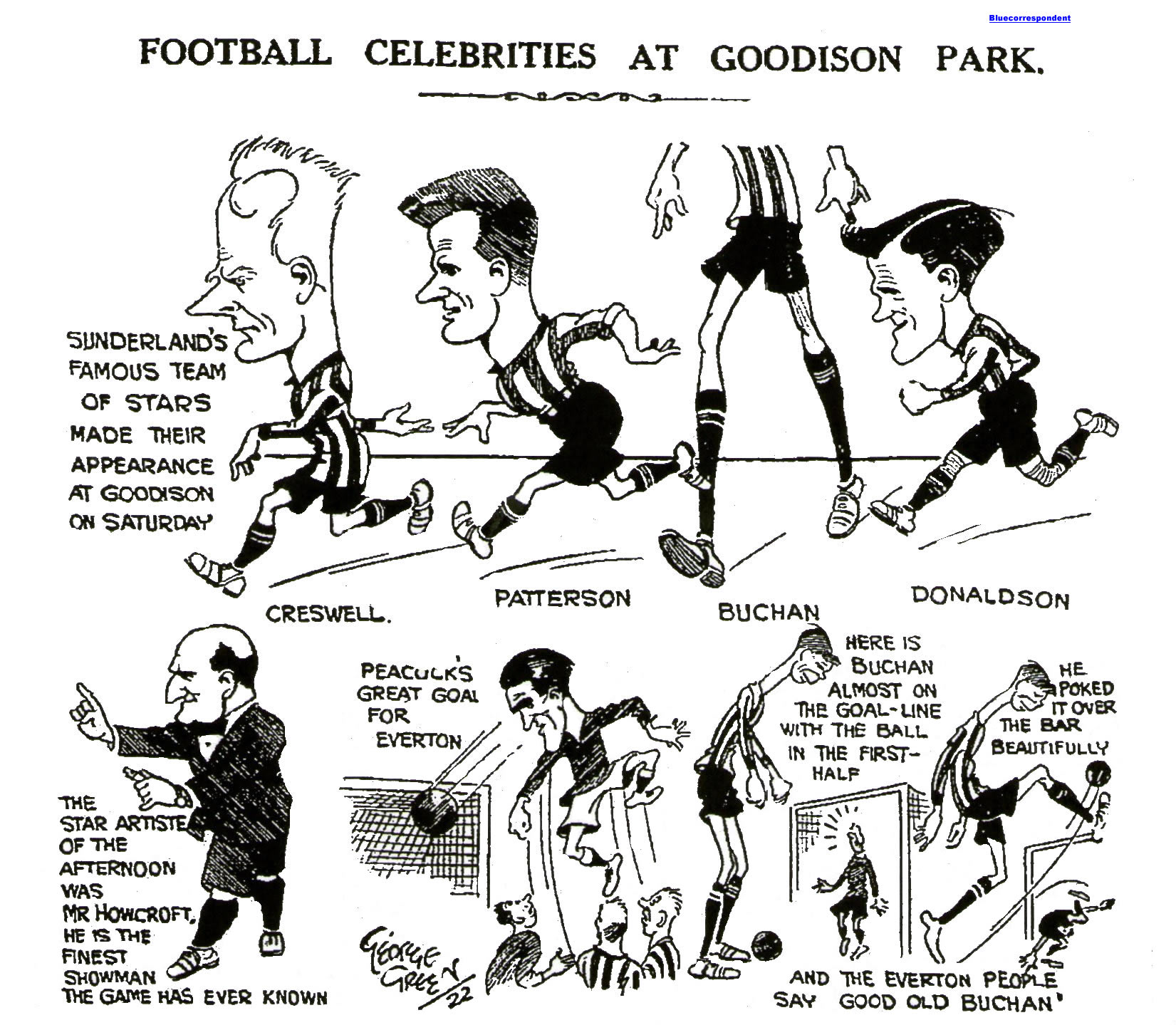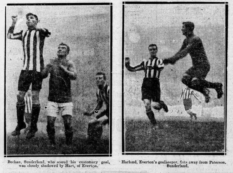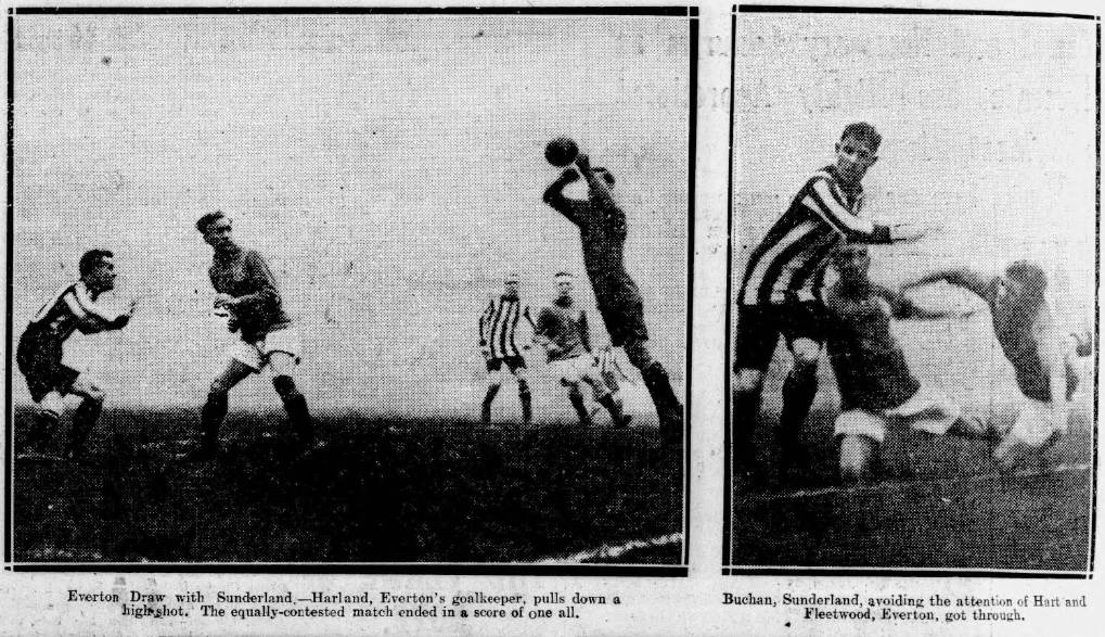 The inclusion of Peacock in the forward line was as we have intimated, quite a success, and Chadwick showed increasing very capable wing, the outside man showing improvement. Williams and Reid made a team and both were speed and dexterity. Grenyer at left half-back seemed overwhelmed by the tremendous onslaught of Donaldson, and Buchan. The Latter, indeed, was the most conspicuous figure of the twenty-two players. He displayed characteristic cleverness, and to him is mainly due the trio of goals that brought such a valuable brace of points. Fleetwood and Hart showed fine football, and the defence left nothing to cavil at, several of Harland's saves being really wonderful. For the home side, Cresswell gave a magnificent exhibition at full back, and Robson fielded the shots that came to hand with skill and dexterity. Teams : - Sunderland: - Robson, goal, Cresswell, and England, backs, Ferguson, Parker and Poole, half-backs, Donaldson, Buchan, Paterson, Hawes, and Ellis, forwards. Everton: - Harland, goal, Raitt, and McDonald, backs, Hart (captain), Fleetwood, and Grenyer, half-backs, Chedgzoy, Peacock, Chadwick, Williams, and Reid, forwards. Referee JT Howcroft.