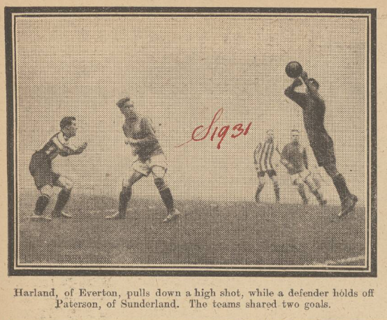Now Sunderland were busy at the other end, and Harland, who had so far been enjoying a comparatively easy task, was called upon to save a warm shot from Buchan. The Evertonians improved materially as the struggle developed and Chedgzoy getting clear away from Poole, centred the ball with such skill that Chadwick headed it only a couple of inches over the bar. It was a very neat movement and roused the visitors to further incursions into the home territory. Sunderland, however, were still to be reckoned with. McDonald was well beaten when he had to concede a free kick, and from this, Ellis to the great chagrin from the crowd, put the leather outside. This was a bad mistake, and it caused the Evertonians to make further efforts. They made play cleverly all along the line, and both Williams and Peacock fired in shots, but they were well stopped.
