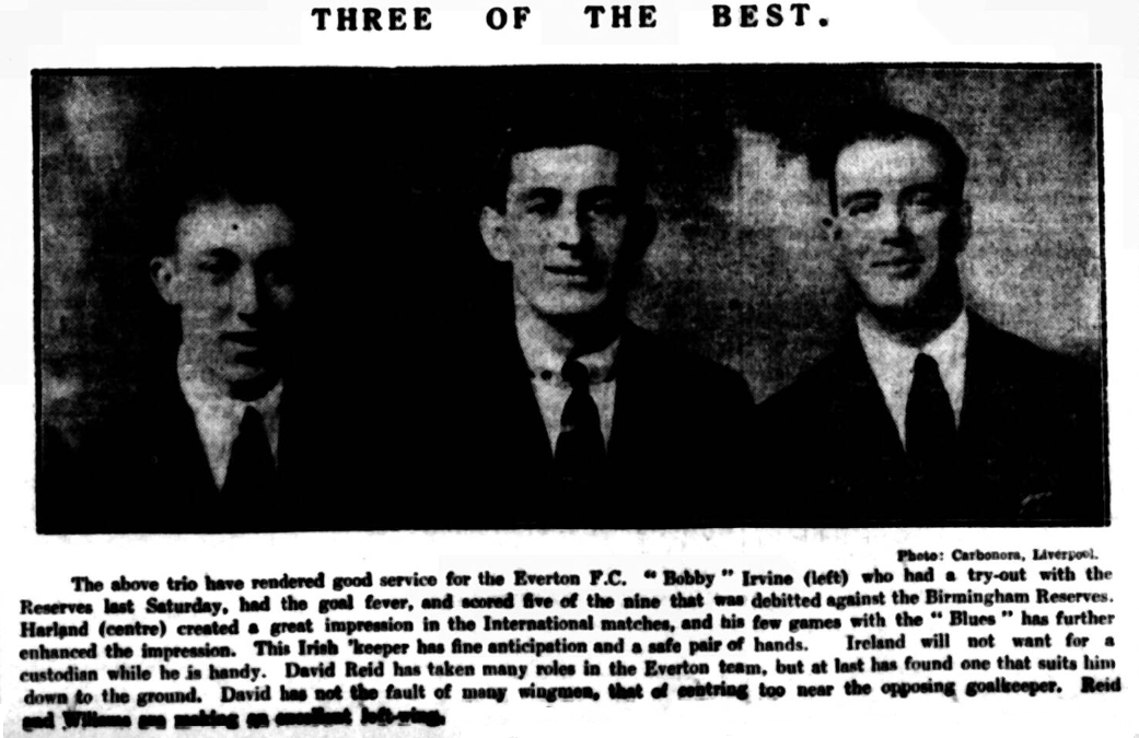 The vagaries of football form were convincingly demonstrated over the week-end in the case of Everton. On Saturday they beat Birmingham by good, sound football and yesterday they played a goalless draw with Manchester City, shaping like a side that was completely off colour. After their fine win over Birmingham they were fully expected to add to their points total yesterday, but few of the players maintained their form, and in the end they had all their work cut out to prevent Manchester from scoring a goal and walking off with both points. Chadwick, who led the line so effectively on Saturday, could do little right, and his shooting was rarely accurate. Peacock was the best of the forwards, who, although good up to a point, failed lamentably in front of goal. Tom Fleetwood stood out among the half backs on both sides, his offensive work being particularly good. Livingstone was cool and resourceful, his clearances to the wings often being the means of providing an opportunity for a raid on the Manchester goal. Harland amongst other good work, saved a penalty although the fact that Browell shot straight at him helped him a great deal. On yesterday’s showing Manchester are not more than an average side. Pringle is a dour half-back, while Allan and Wilson are a pair of good backs. The forwards suffered from the same complaint as the Everton quintet. Everton; Harland; Raitt, Livingstone; Brown, Fleetwood, Hart (Captain); Jones, Peacock, Chadwick, Williams, Reid. Manchester City; T.F. Mitchell; Wilson, Allan; Sharp, Hamill, Pringle, Browell, Roberts, Johnson, Barnes, Murphy.