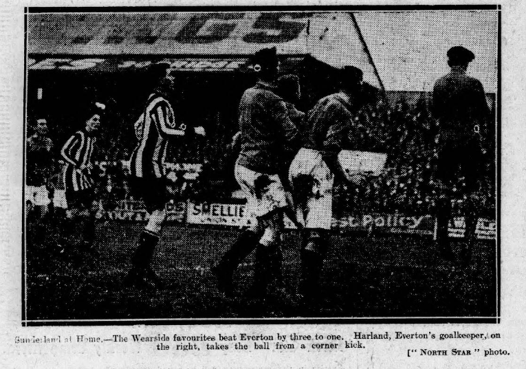 When the game commenced at Roker Park on Saturday it looked as though the long sequence of victories which Everton had enjoyed on Wearside was likely to be continued but it was soon demonstrated that a goal against a team is one of the best energisers the side in arrears can have. It is eight years since the Sunderland supporters saw Everton fail to take away both points at Roker, but by the display of the Wearsiders on Saturday, after Sunderland had shaken off their lethargy, the 25,000 present were convinced that on that form Everton would not again overcome them. There is no mistaking the fact that Sunderland’s strength lies forward, and when the defence is of equal ability- as they were on Saturday-then few teams, if any, can hope to carry off the points. Everton’s directors had reshuffled their ranks because Irvine’s inability to figure in the side, but it cannot be said that Peacock was a success as a forward. His place is without doubt in the half back line, and had he been there it is questionable whether Sunderland would have enjoyed the scope which was allowed to the forwards. Hart had changed wings in the half-back line, and there was no gainsaying the fact that his display easily qualifies him for a place in England’s eleven.