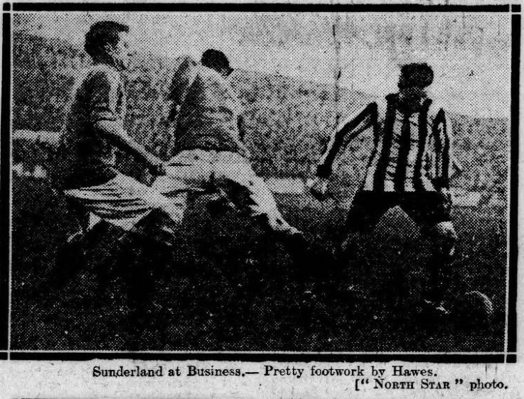 It had proved a very strenuous first half, and Sunderland were rather lucky to hold the lead, for their opponents had enjoyed as much of the game. In the matter of close play and footwork generally they were quite the equal of the Wearsiders. Peacock proved that he can play in the forward line quite as well as any of his fellow players.