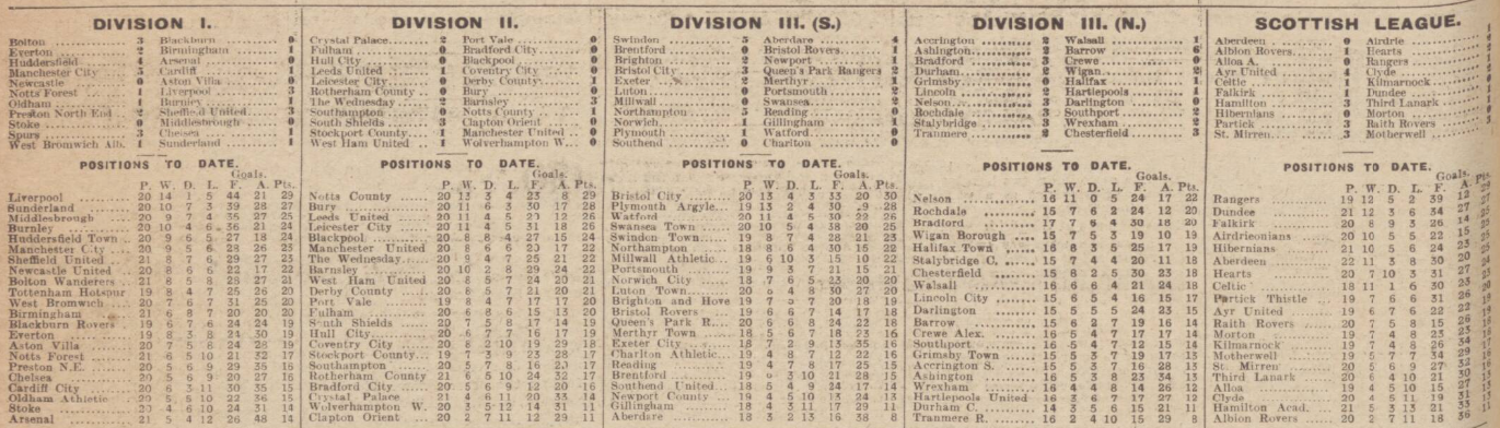 After their victory over Birmingham on Saturday, Everton were expected to further improve their position as the result of Manchester City's visit to Goodison Park, but few of the players maintained their form, and a moderate game ended in a goalless draw. Chadwick, who led the line so effectively on Saturday on Saturday, could do little right, and his shooting was rarely accurate. Peacock was the best of the forwards, who although good up to a point failed badly in front of goal. Tom Fleetwood stood out among the half-backs on both sides, his offensive work being particularly good. Livingstone was cool and resourceful, his clearances to the wings often being the means of providing an opportunity for a raid on the Manchester goal. Harland amongst other good work, saved a penalty kick , which Browell shot straight at him. Teams : - Everton: - Harland, goal, Raitt, and Livingstone, backs, Brown, Fleetwood, and Hart (captain), half-backs, Jones, Peacock, Chadwick, Williams, and Reid, forwards. Manchester City: - Mitchell, goal, Wilson, and Allan, backs, Sharp, Hamill, and Pringle, half-backs, Browell, Roberts, Johnson, Barnes and Murphy, forwards.
