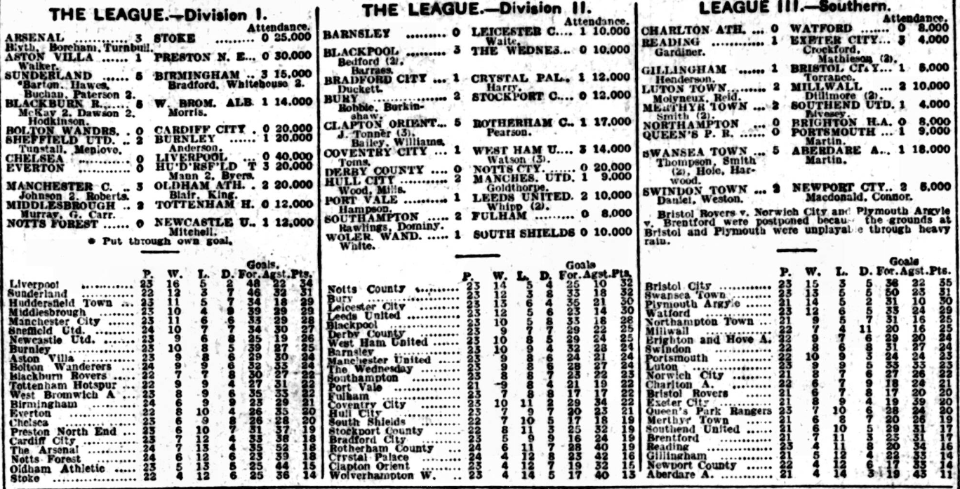 Everton go to Sunderland and we shall be very concerned about their game, because we recognise Sunderland as one of the star teams of the day. They took a long time to settle down, but having got into good order they are making the best of teams go all the way. In truth, they are the biggest challengers to Liverpool. Everybody will recognise that by bringing in Grenyer to his old place and putting Peacock at inside right, the Everton club has aimed at height and weight and experience. It has meant a big shuffle in the half-back line, because Hart, the captain, has had to turn to right half back. However, who shall say that to-morrow will not produce a surprise result? I won’t for one, although I can appreciate the difficulties of the Everton side in having to go to Roker Park at the very moment when Sunderland are at their best. Everton; Harland; Raitt, McDonald; Hart, Fleetwood, Grenyer; Chedgzoy, Peacock, Chadwick, Williams, Reid. Sunderland; Robson; Cresswell, England; Ferguson, Parker, Poole; Donaldson, Buchan, Paterson, Brown, Ellis.